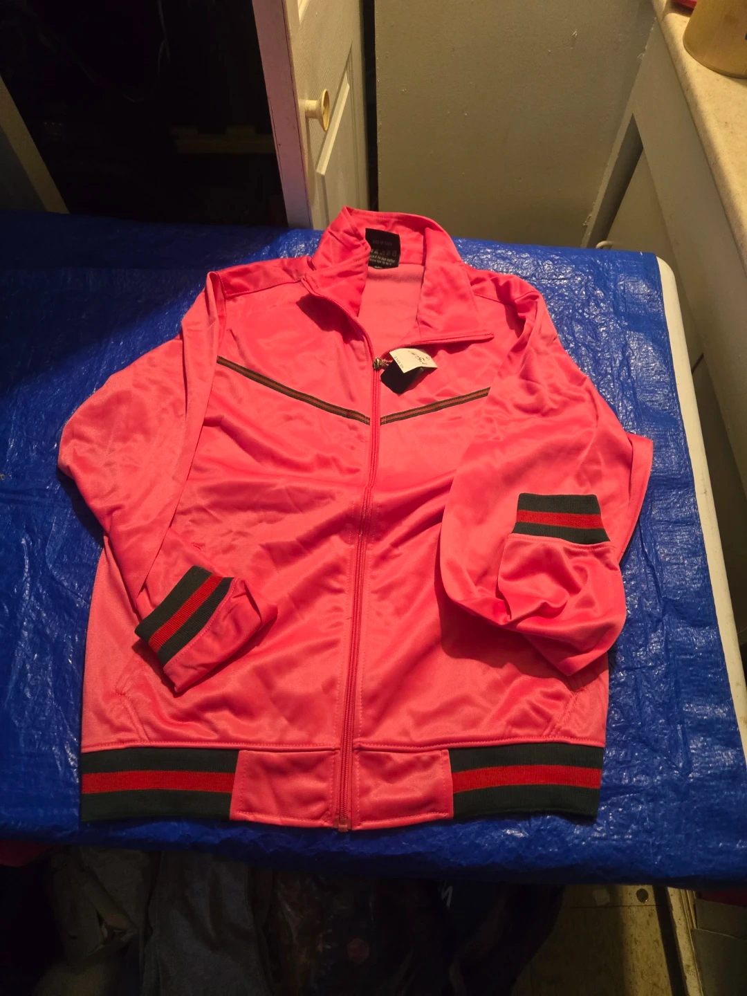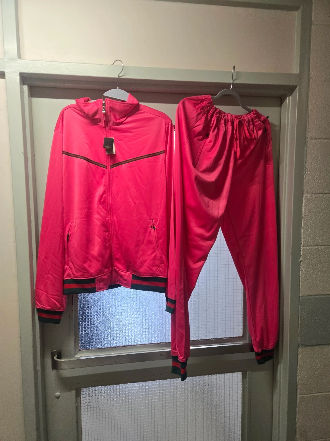 Selling a pink tracksuit set. It features a jacket and matching pants. The jacket has a zipper and the pants have an elastic waistband. Great for casual wear or workouts!