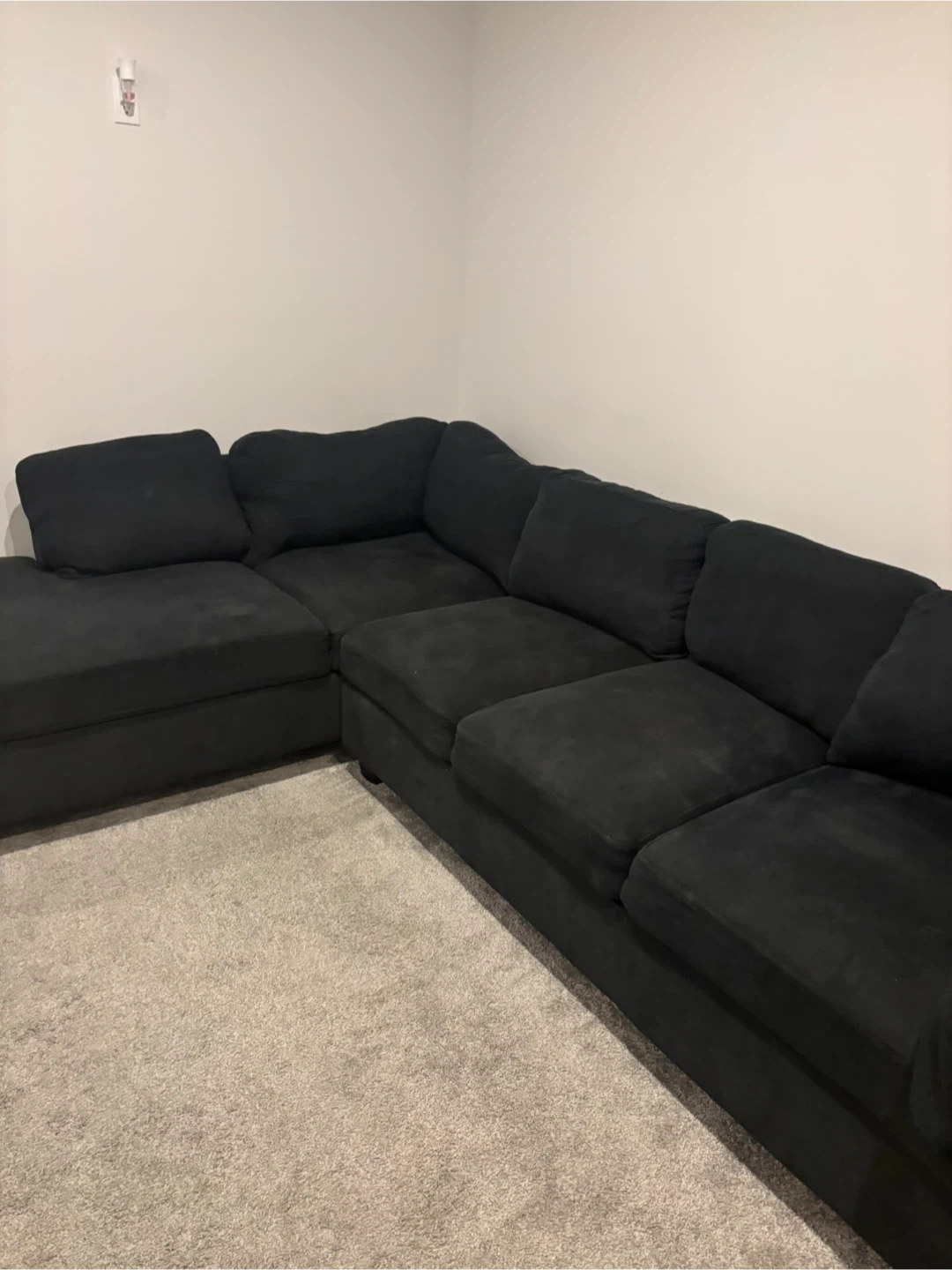 Selling a large, comfy black sectional sofa. It's in great condition and would be perfect for a living room or entertainment space. It's a great piece to relax on after a long day