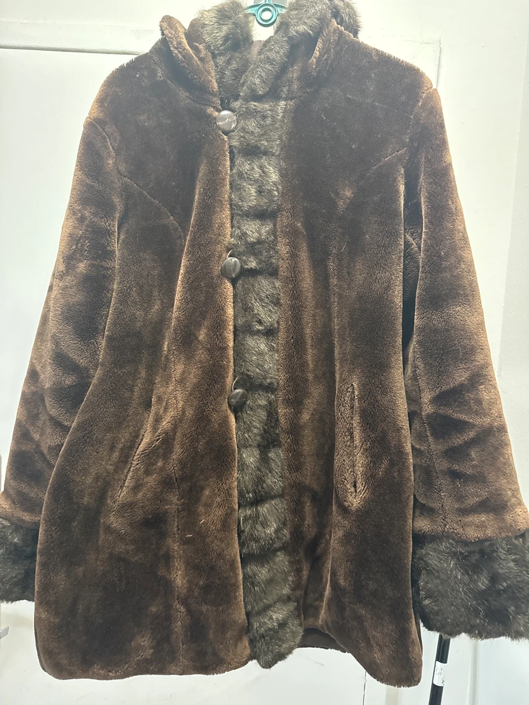 Cozy Guillaume coat with faux fur trim in a lovely brown colour! It's a size L/G and made in China. The outer shell is 100% polyester, so it's nice and durable. Perfect for staying warm and stylish during the colder months