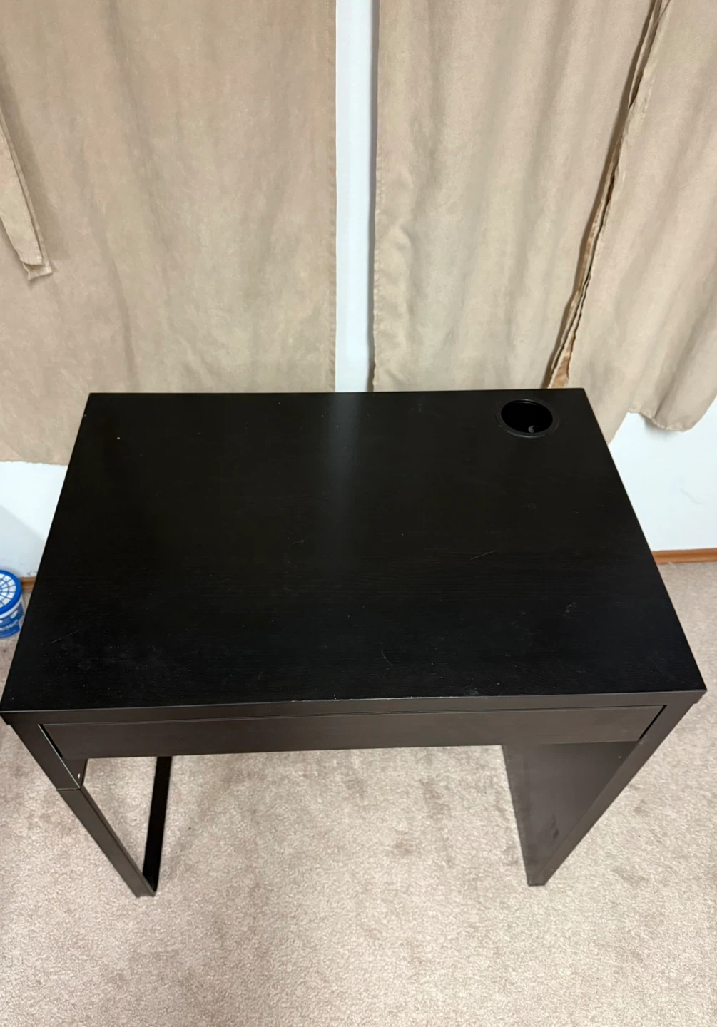 Selling a simple black/brown desk, perfect for a small space or home office! It includes a handy drawer for storage and a cup holder on the surface. It's in great condition and ready for a new home