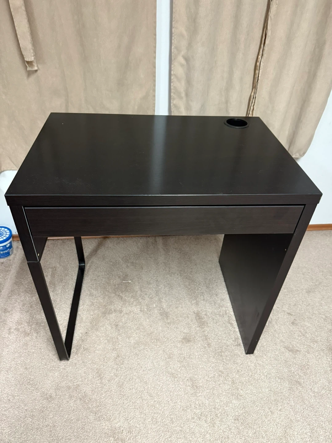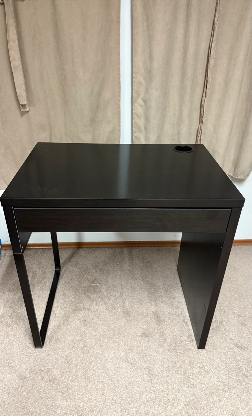 Selling a simple black/brown desk, perfect for a small space or home office! It includes a handy drawer for storage and a cup holder on the surface. It's in great condition and ready for a new home
