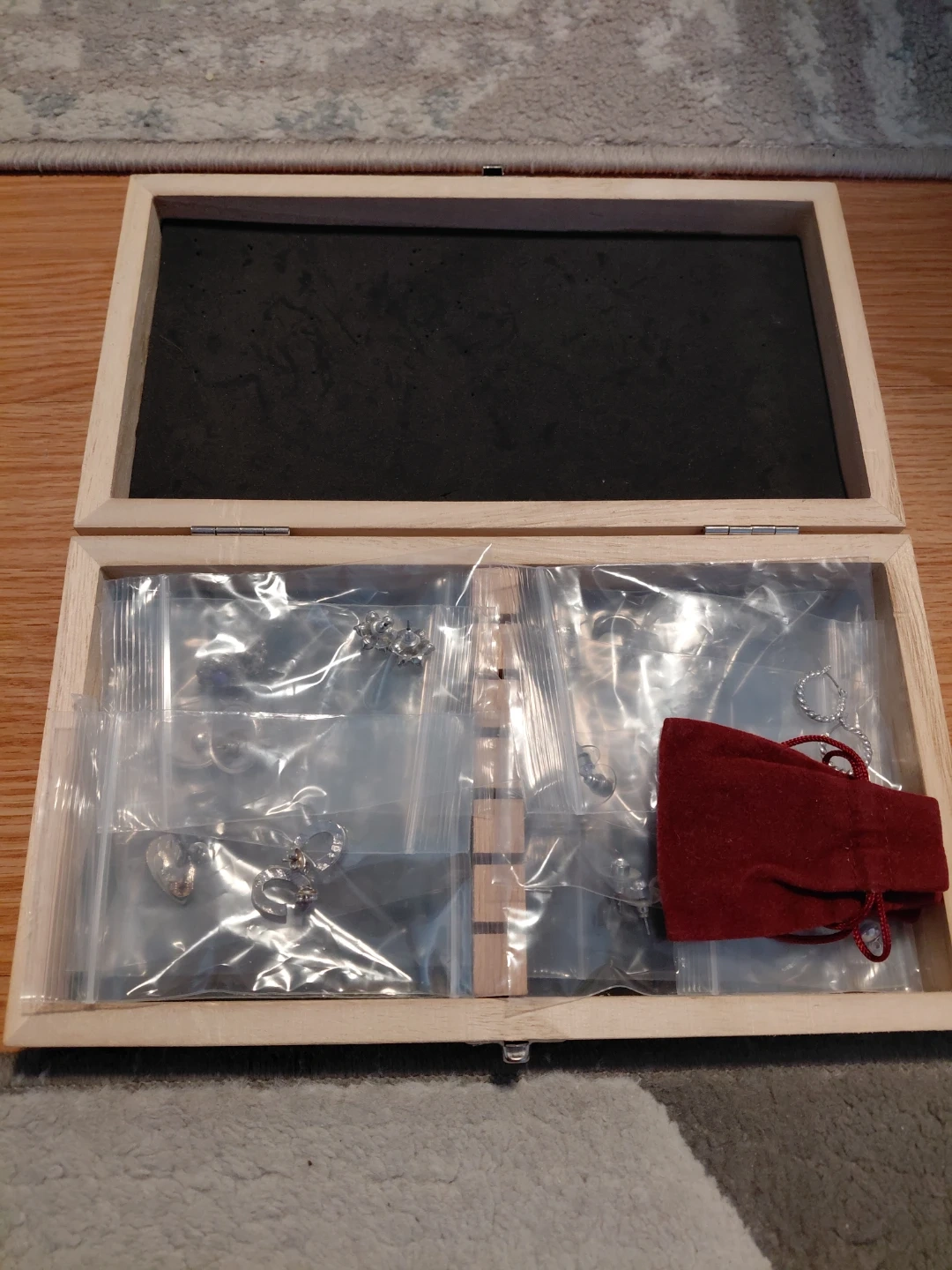 A collection of assorted earrings in various styles and colours! All in silver setting with diamond, purple, blue, and yellow and black simulantv stones available. Perfect for adding a little sparkle to your day. Comes with a lovely balsa wood storage box. $10 for all or $2 a pair. CASH ONLY. NO DELIVERY.