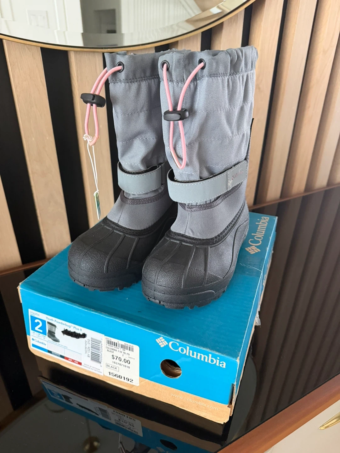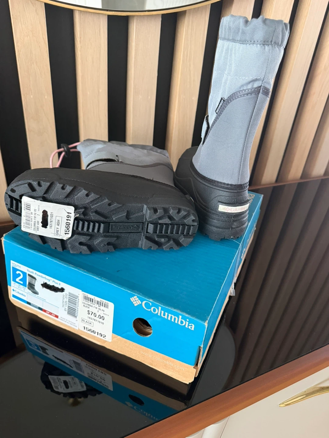 These Columbia Youth Powderbug Plus II snow boots are in excellent condition and ready for some winter fun! They come in a stylish grey ash and black colour, and are a size 2. The original box is included! Retail price is $84.