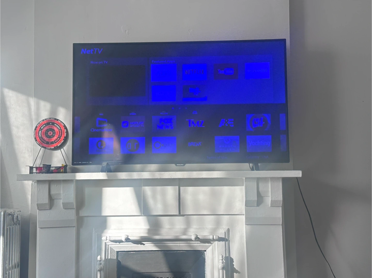 This TV has a blue screen, it comes with its remote, it works perfectly fine, it just has this one defect. If you're skilled at repairs or think you can restore it, it's yours.