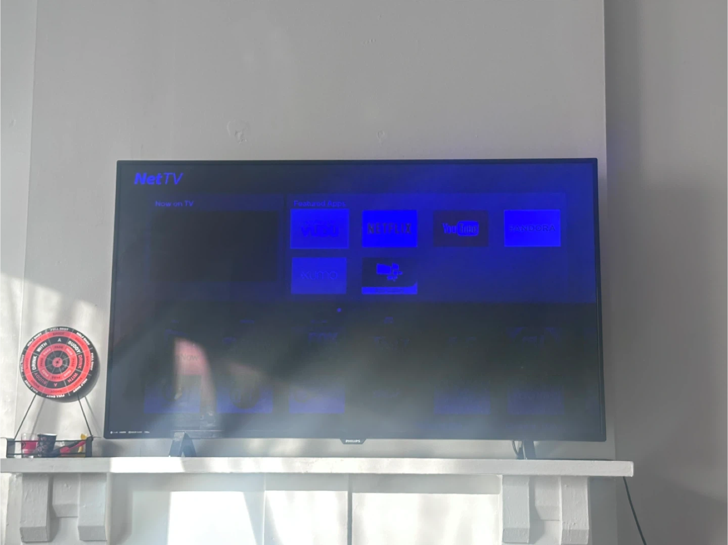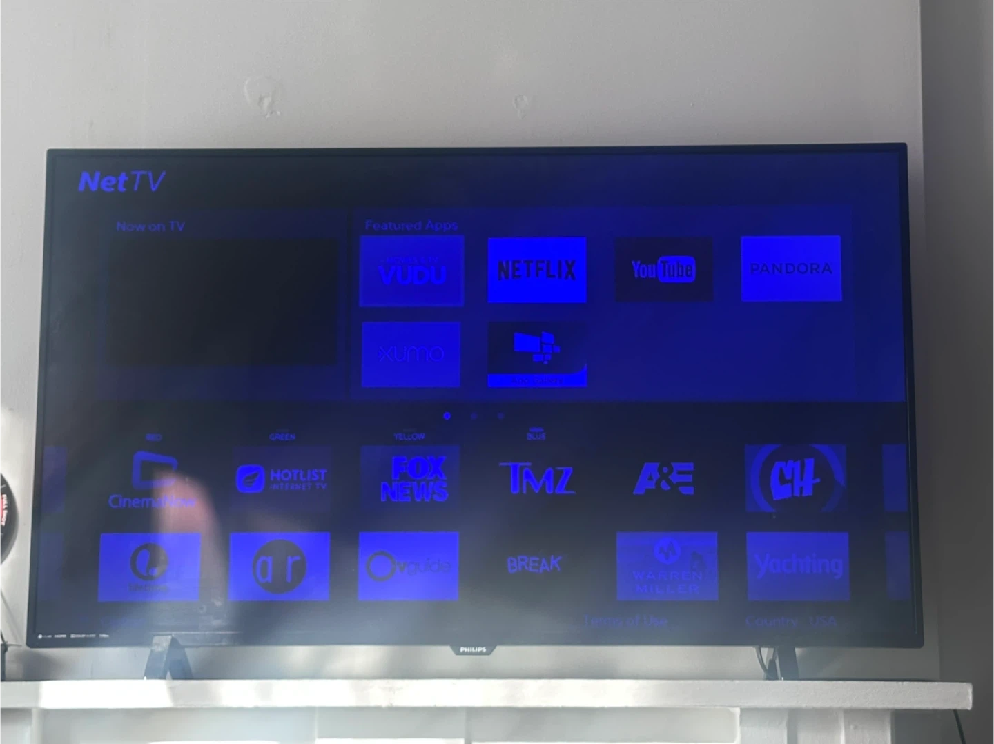 This TV has a blue screen, it comes with its remote, it works perfectly fine, it just has this one defect. If you're skilled at repairs or think you can restore it, it's yours.