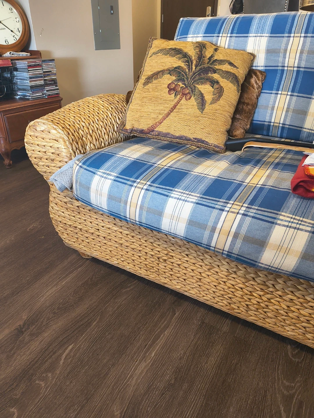 Free. You move it. Comfortable wicker sofa featuring blue plaid cushions and a decorative. The sofa has a unique woven design and a relaxed, casual style. Perfect for adding a touch of cozy charm to your living space