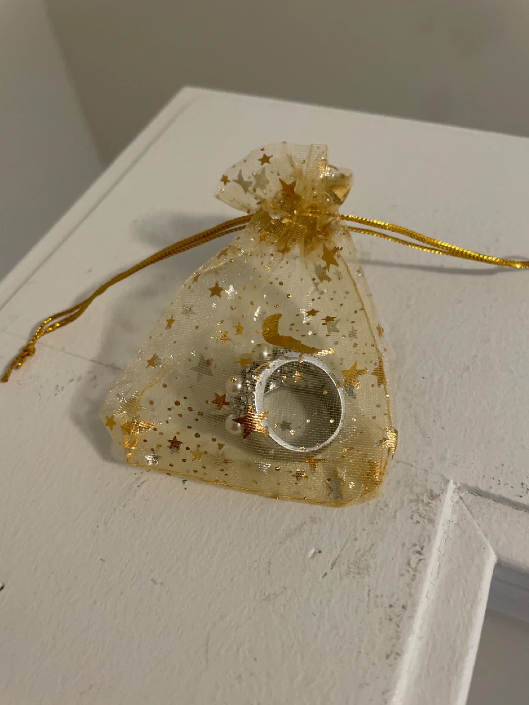 This is a beautiful statement ring featuring faux pearls and rhinestones. It's in great condition and comes in a cute little drawstring bag. Perfect for adding a touch of elegance to any outfit!