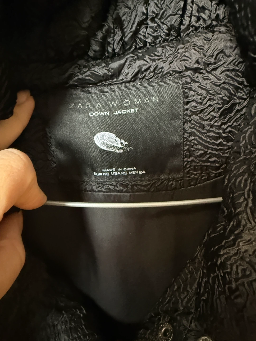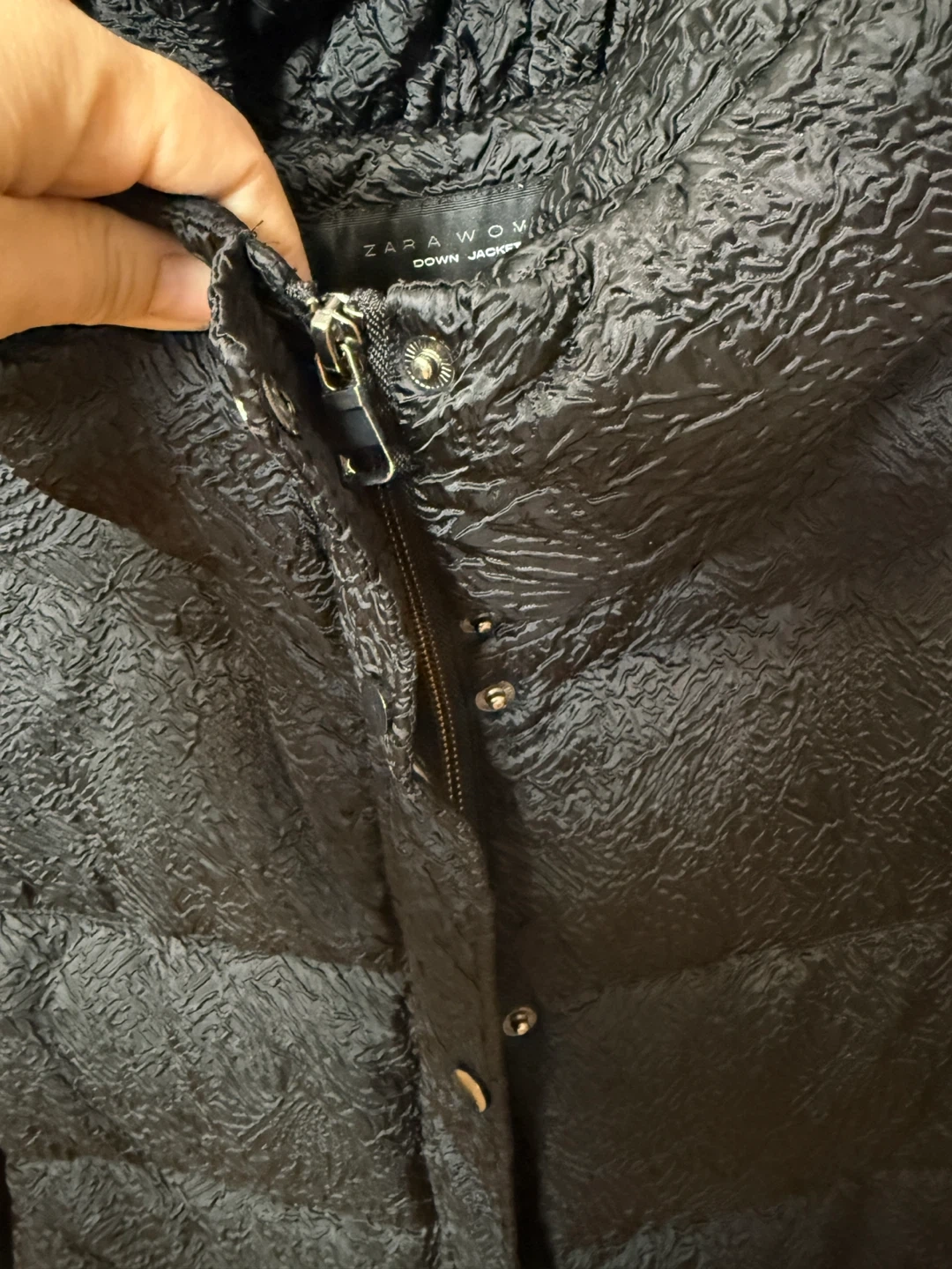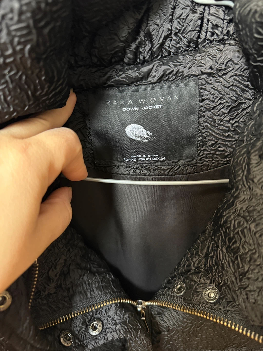 Selling a Zara Woman down jacket in black. It's in great condition and features a unique textured pattern. The size is XS. It fits perfectly for a size M too