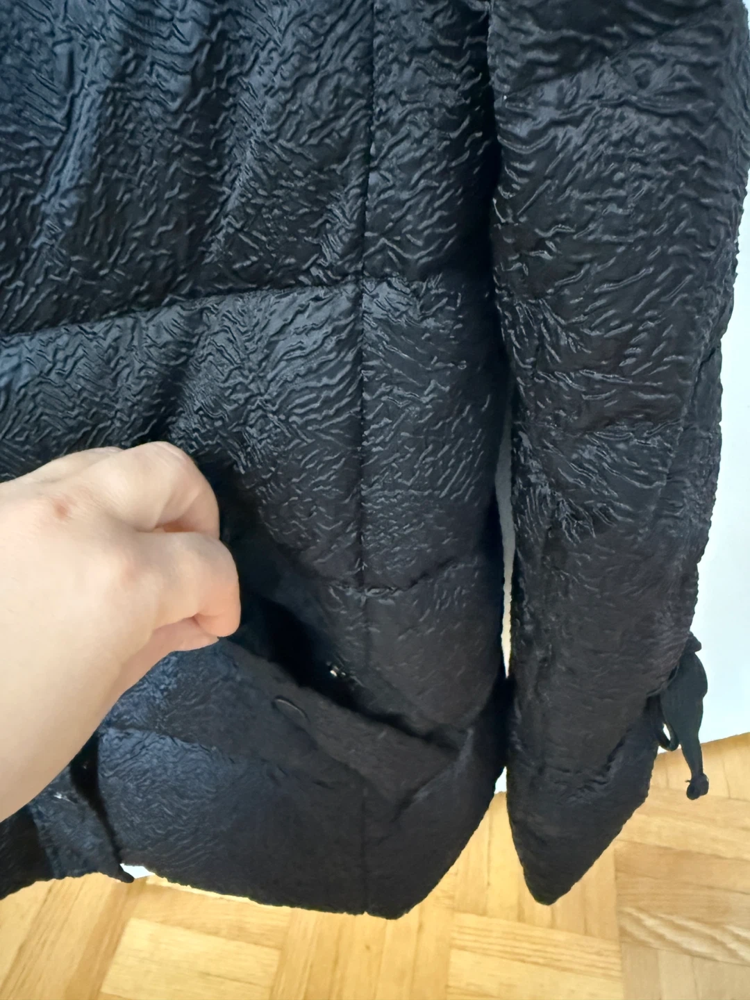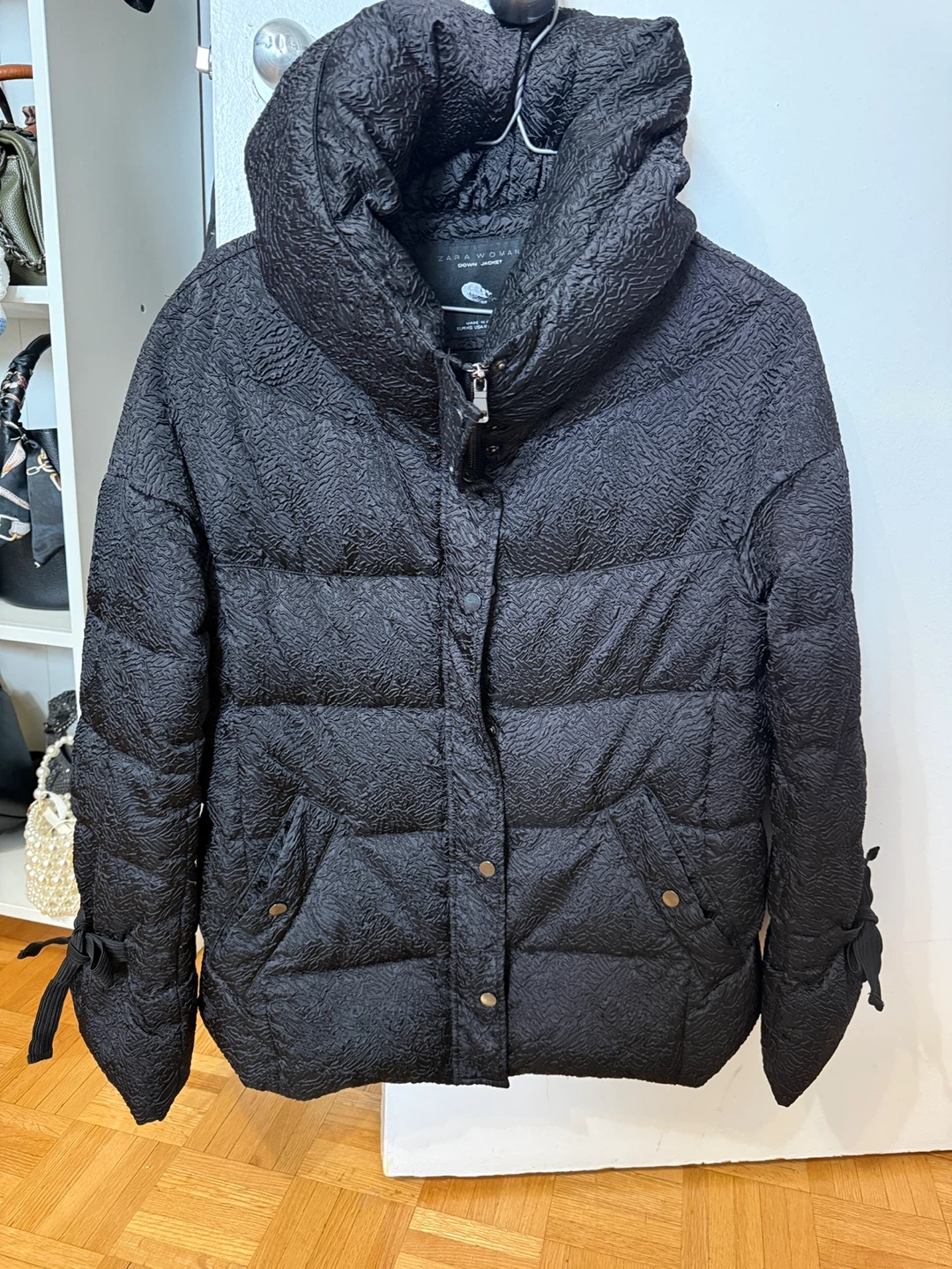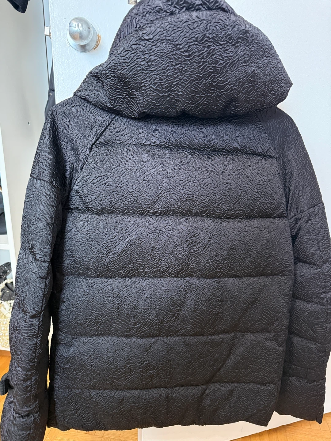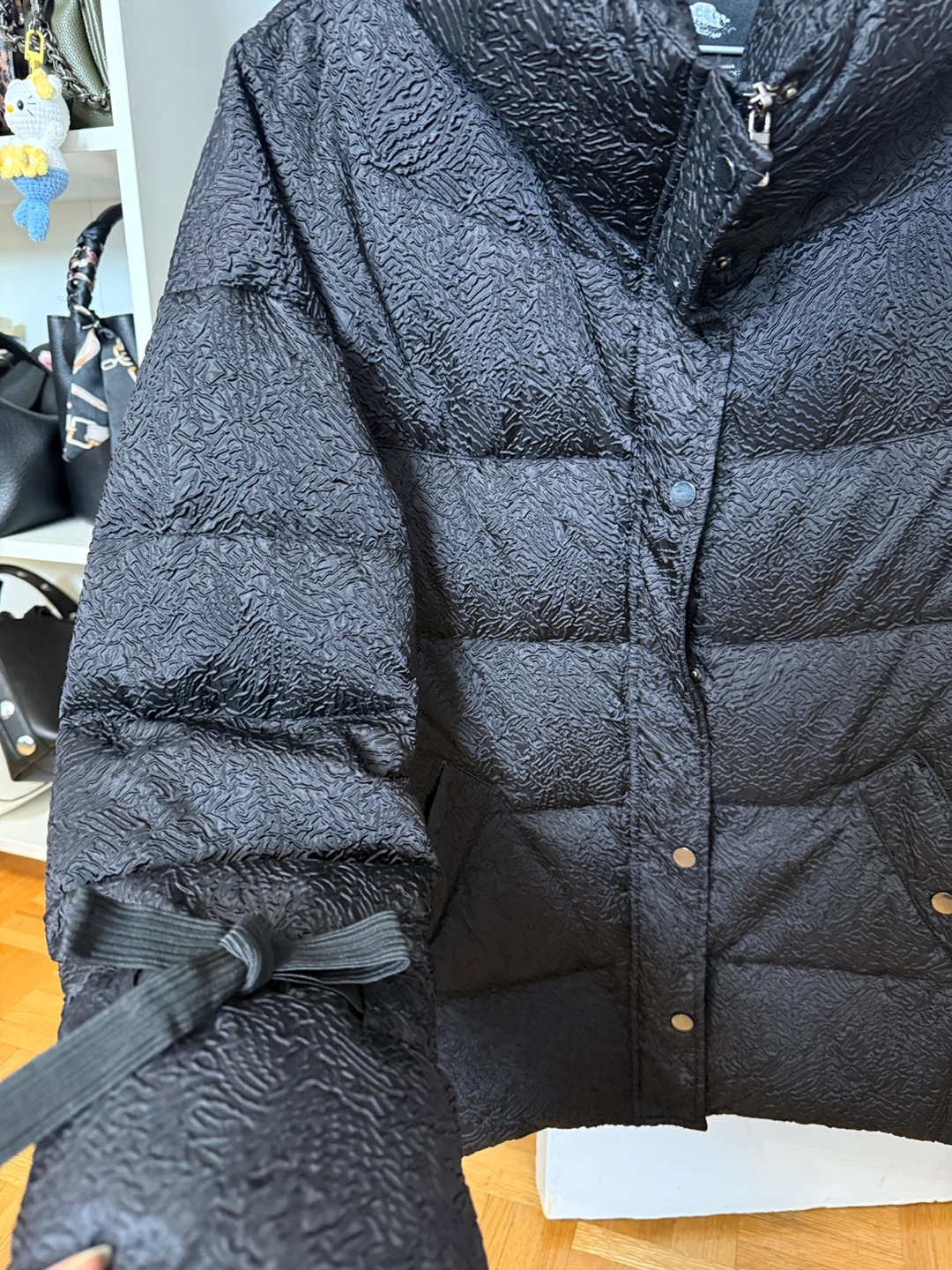 Selling a Zara Woman down jacket in black. It's in great condition and features a unique textured pattern. The size is XS. It fits perfectly for a size M too