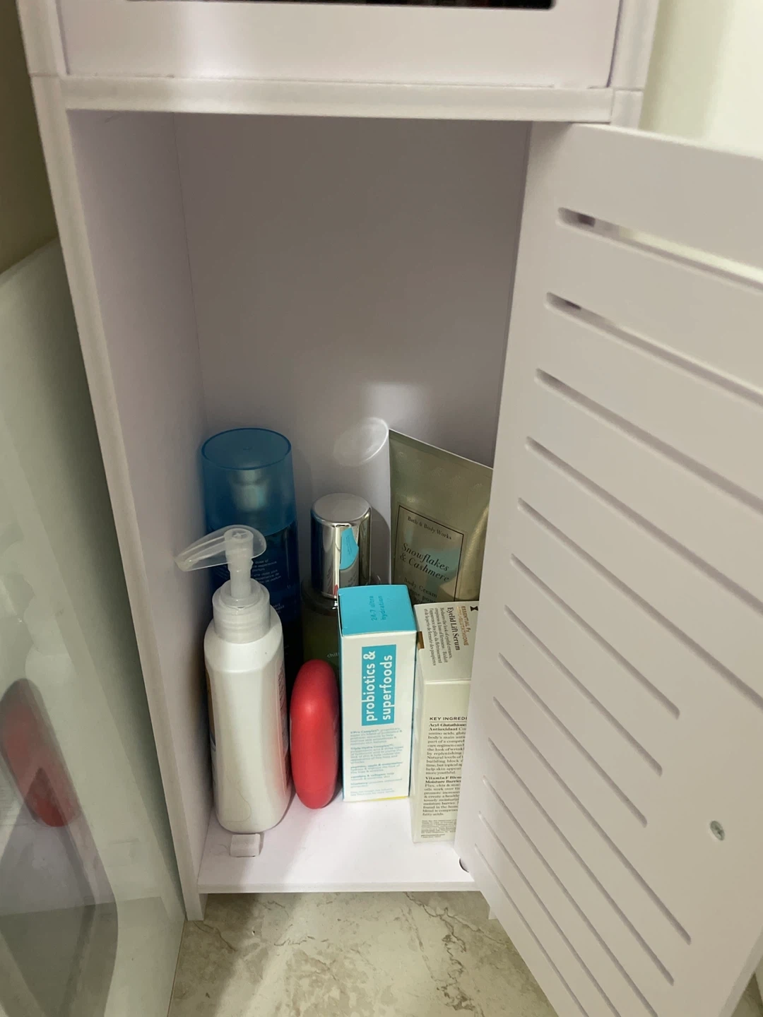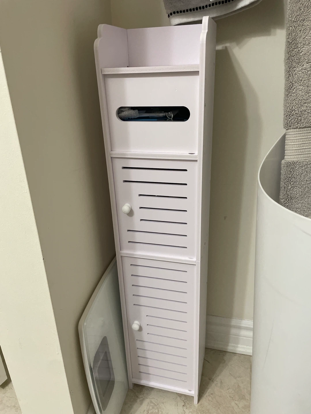 Selling a white bathroom storage cabinet! It's perfect for organizing your toiletries and keeping your bathroom tidy. It features multiple shelves and a compact design, making it ideal for smaller spaces. Great for storing all your essentials!