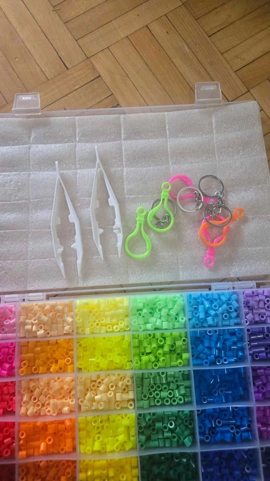 Never used, fuse beads with keychain attachments and tweezers