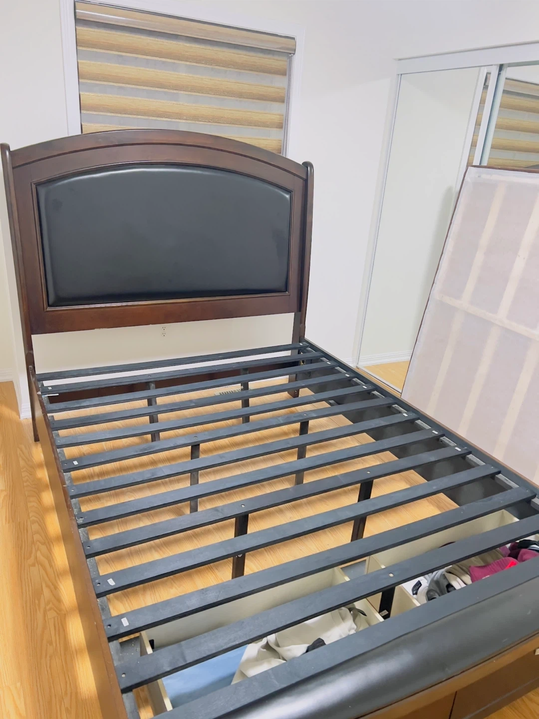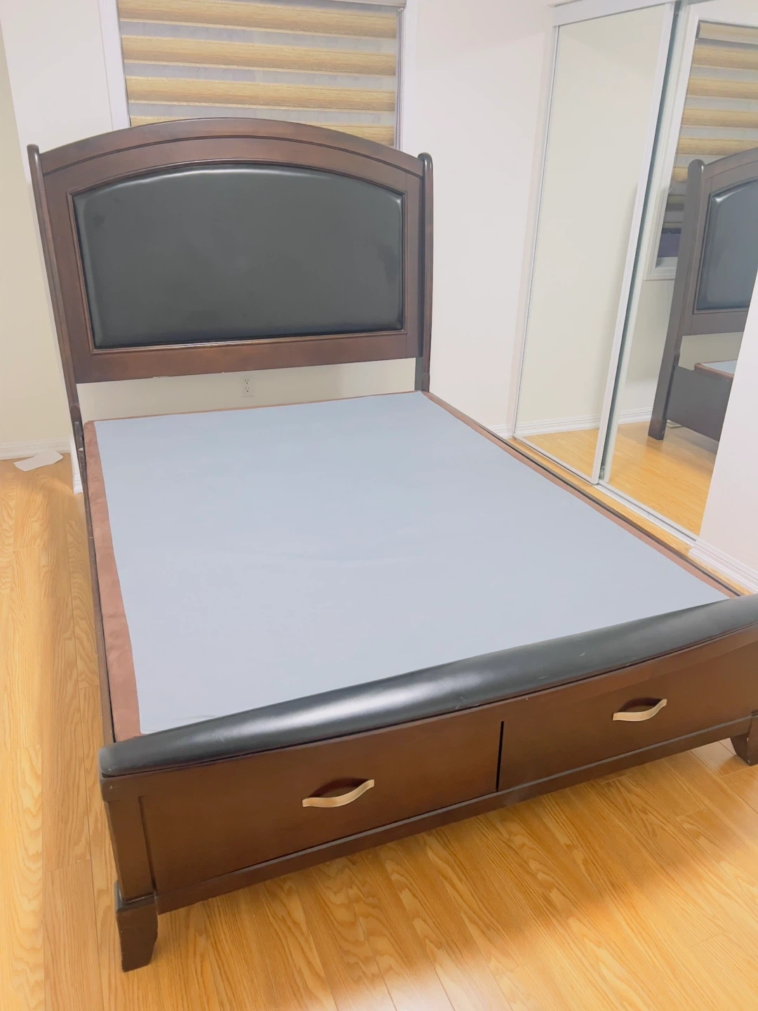 Selling a queen-sized bed frame in dark wood. It features a headboard with a black upholstered panel and built-in storage drawers at the foot of the bed. Perfect for adding some extra storage to your bedroom!