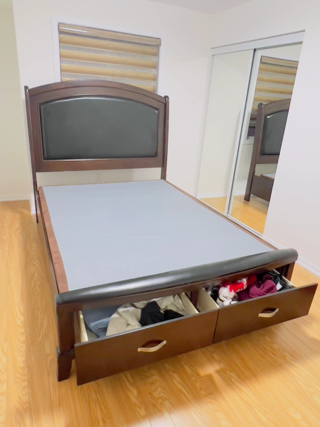 Selling a queen-sized bed frame in dark wood. It features a headboard with a black upholstered panel and built-in storage drawers at the foot of the bed. Perfect for adding some extra storage to your bedroom!