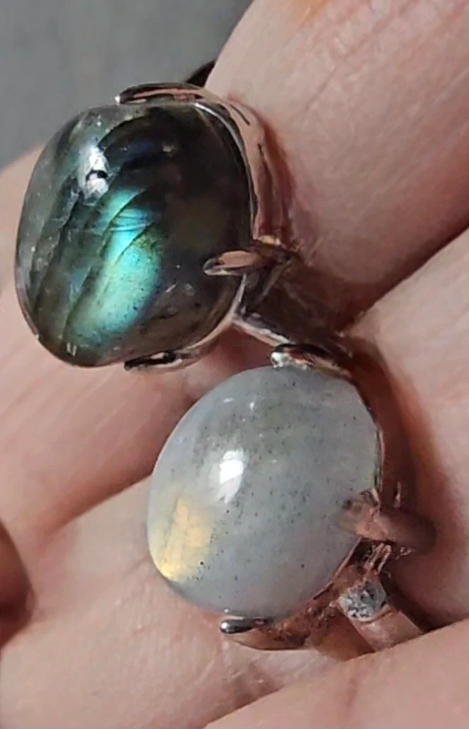 Selling these beautiful labradorite gem rings! They feature a crystal with a striking blue and orange flash, set in a copper ring. A unique and eye-catching piece! Labradorite is a stone of magic and mystery, said to promote psychic ability, intuition and spiritual enlightenment. It is also said to be a powerful protector, warding off negative energies and helping to keep the aura clear and balanced. $25 each ring dark and light Grey crystsls