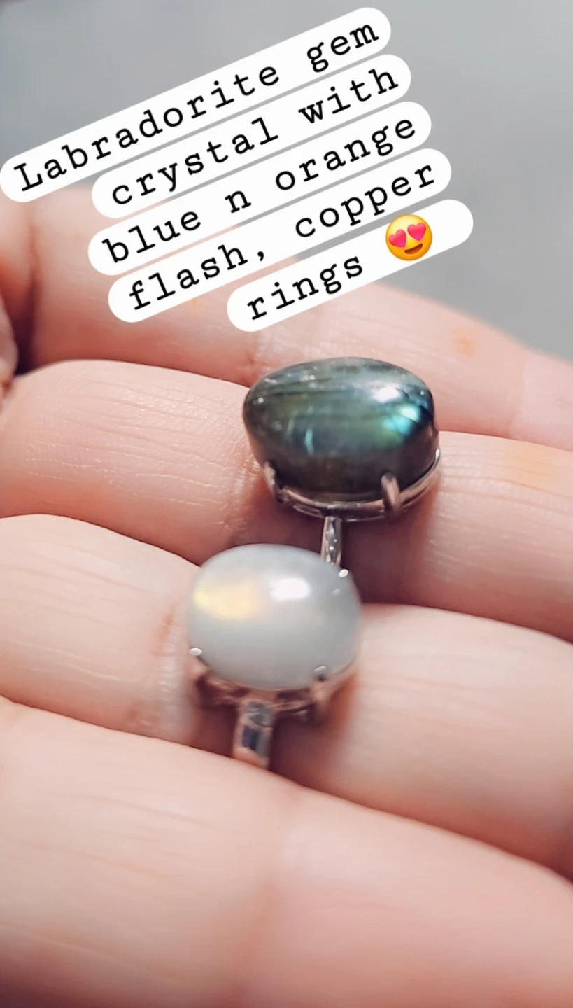 Selling these beautiful labradorite gem rings! They feature a crystal with a striking blue and orange flash, set in a copper ring. A unique and eye-catching piece! Labradorite is a stone of magic and mystery, said to promote psychic ability, intuition and spiritual enlightenment. It is also said to be a powerful protector, warding off negative energies and helping to keep the aura clear and balanced. $25 each ring dark and light Grey crystsls