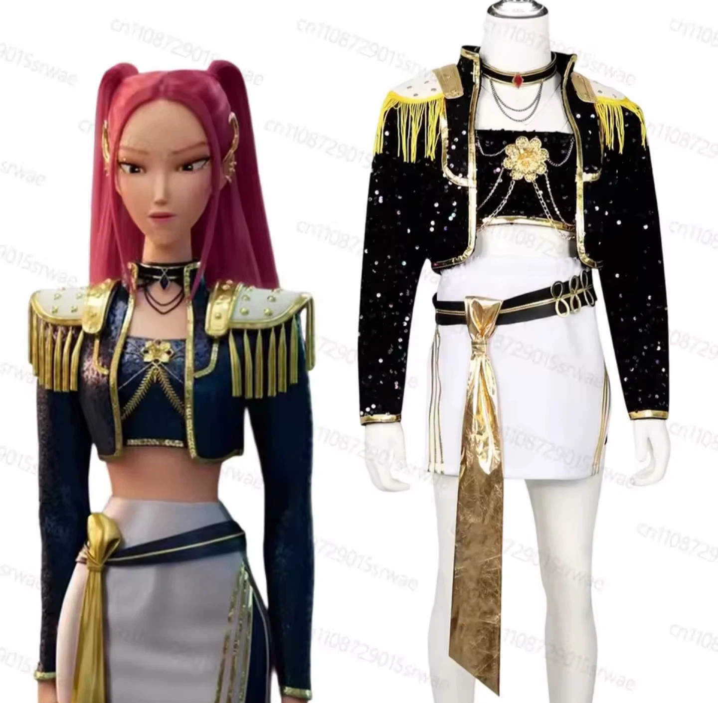 Selling a Kpop inspired close to actual costume! Also available on rent at a lower price. It features a black and gold jacket, a top with a gold flower accent, and a white skirt with gold detailing. All ornaments are real. Perfect for any K-pop fan!