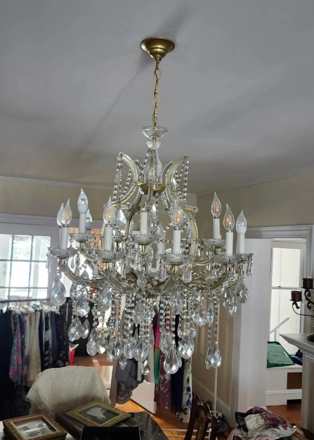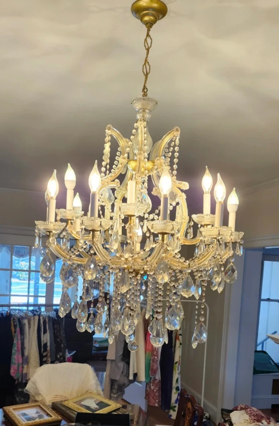 Beautiful crystal chandelier in great condition. It features multiple tiers of sparkling crystals that catch the light beautifully. Perfect for adding a touch of elegance to any room