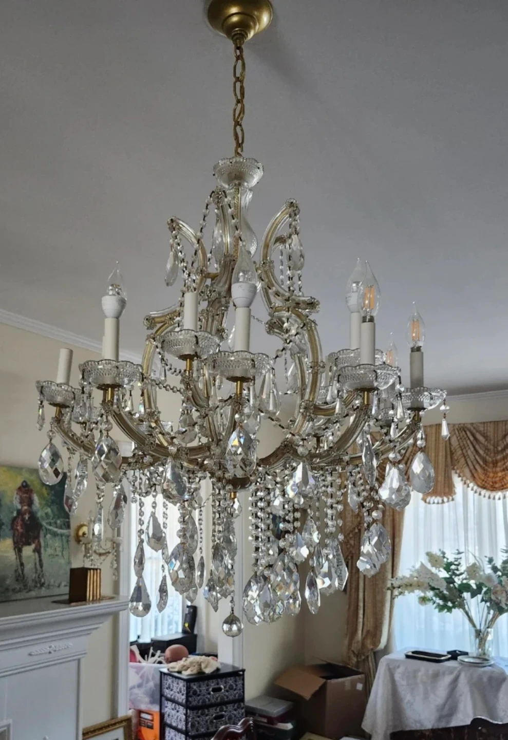 Beautiful crystal chandelier in great condition. It features multiple tiers of sparkling crystals that catch the light beautifully. Perfect for adding a touch of elegance to any room