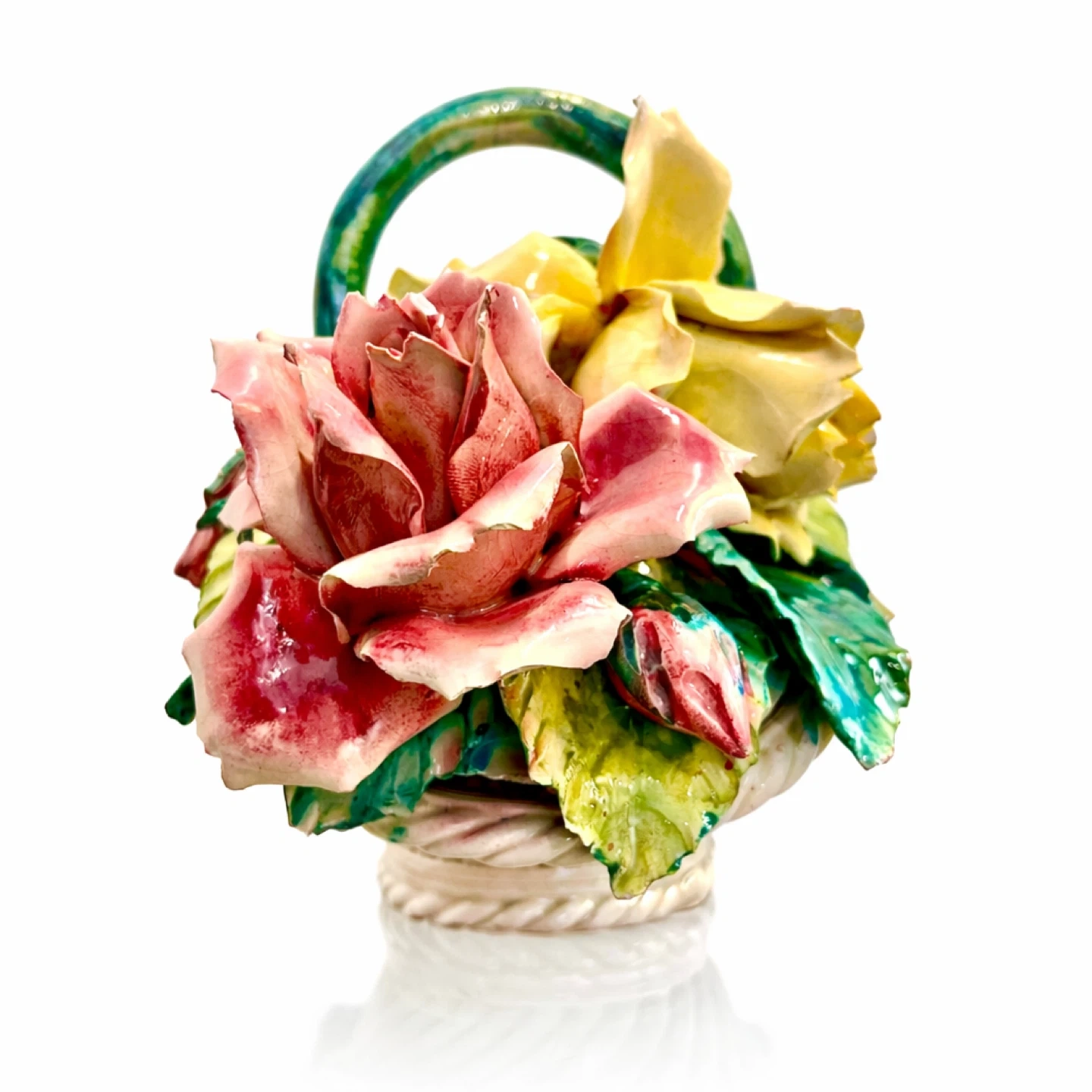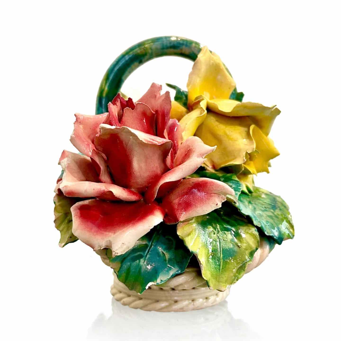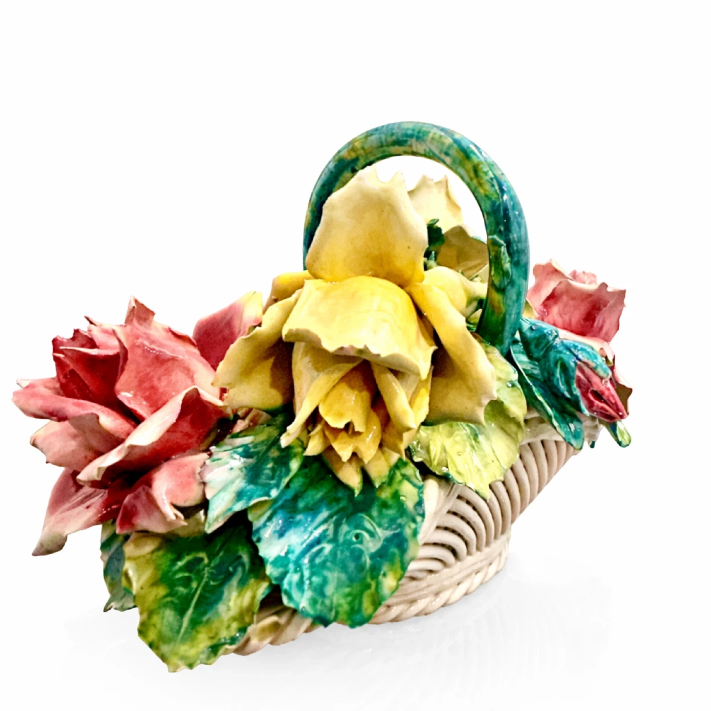 Highly decorative Italian porcelain floral basket featuring full-bloom pink and yellow roses with lush green leaves and a green-glazed handle. The modeling is dimensional and detailed, with a convincing basket-weave body and a dense floral arrangement suited for collector display (Italian decorative porcelain / Capodimonte-style tradition).