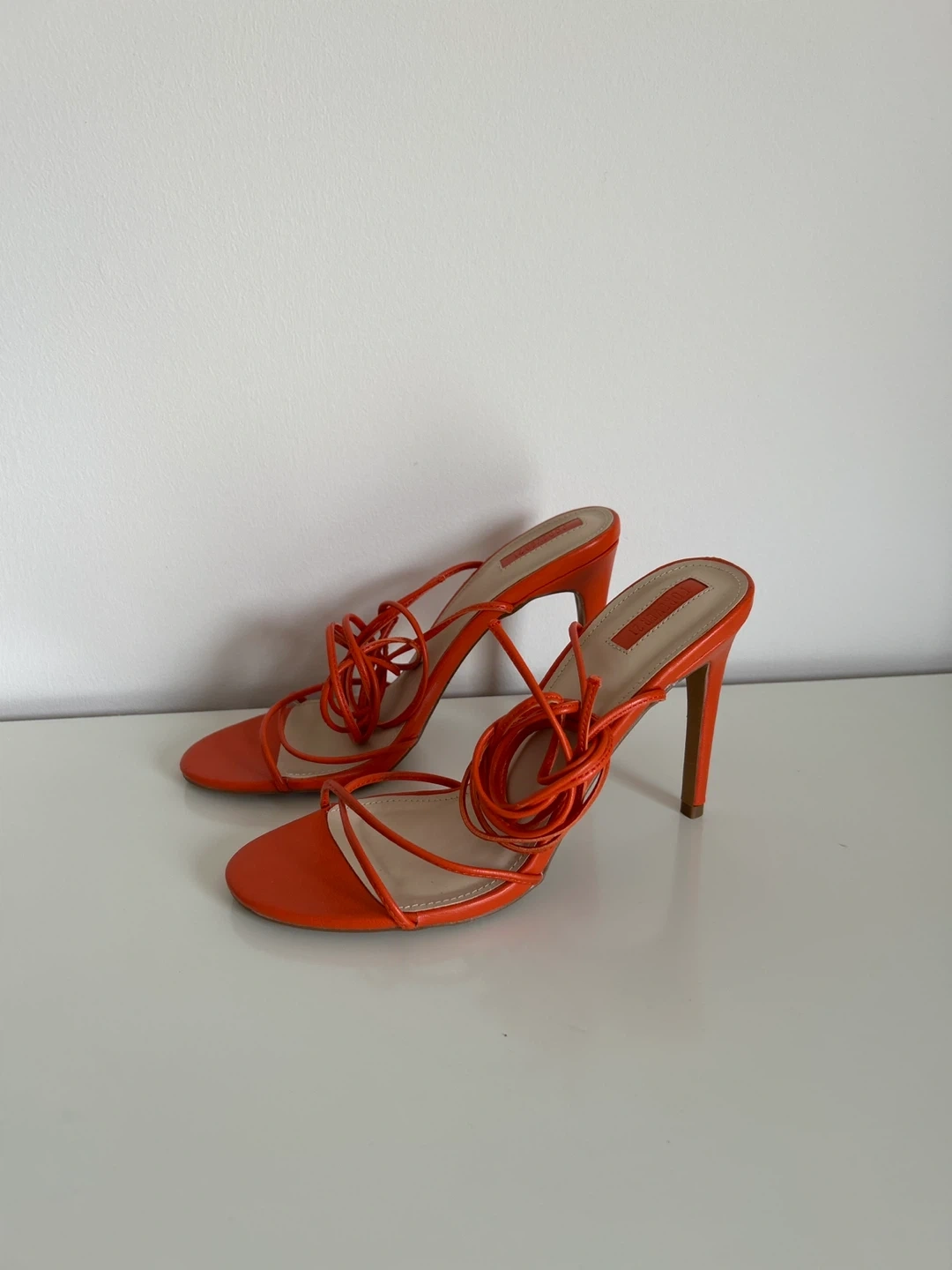 These are a pair of vibrant orange lace-up heels from Forever 21. They're perfect for adding a pop of colour to any outfit. The shoes feature a stylish strappy design that wraps around the ankle, offering a chic and trendy look. These heels are in great condition and ready for a new home!
