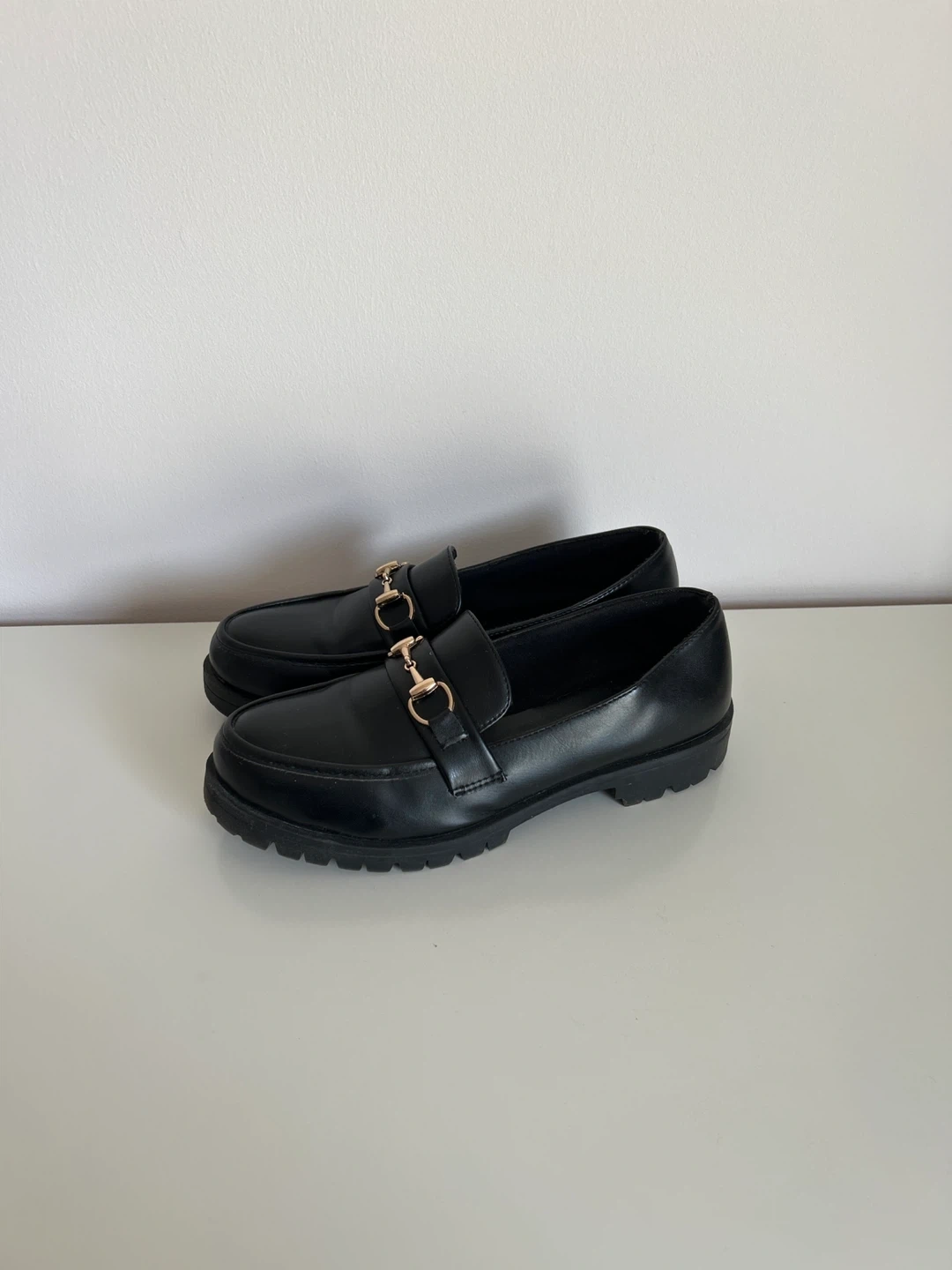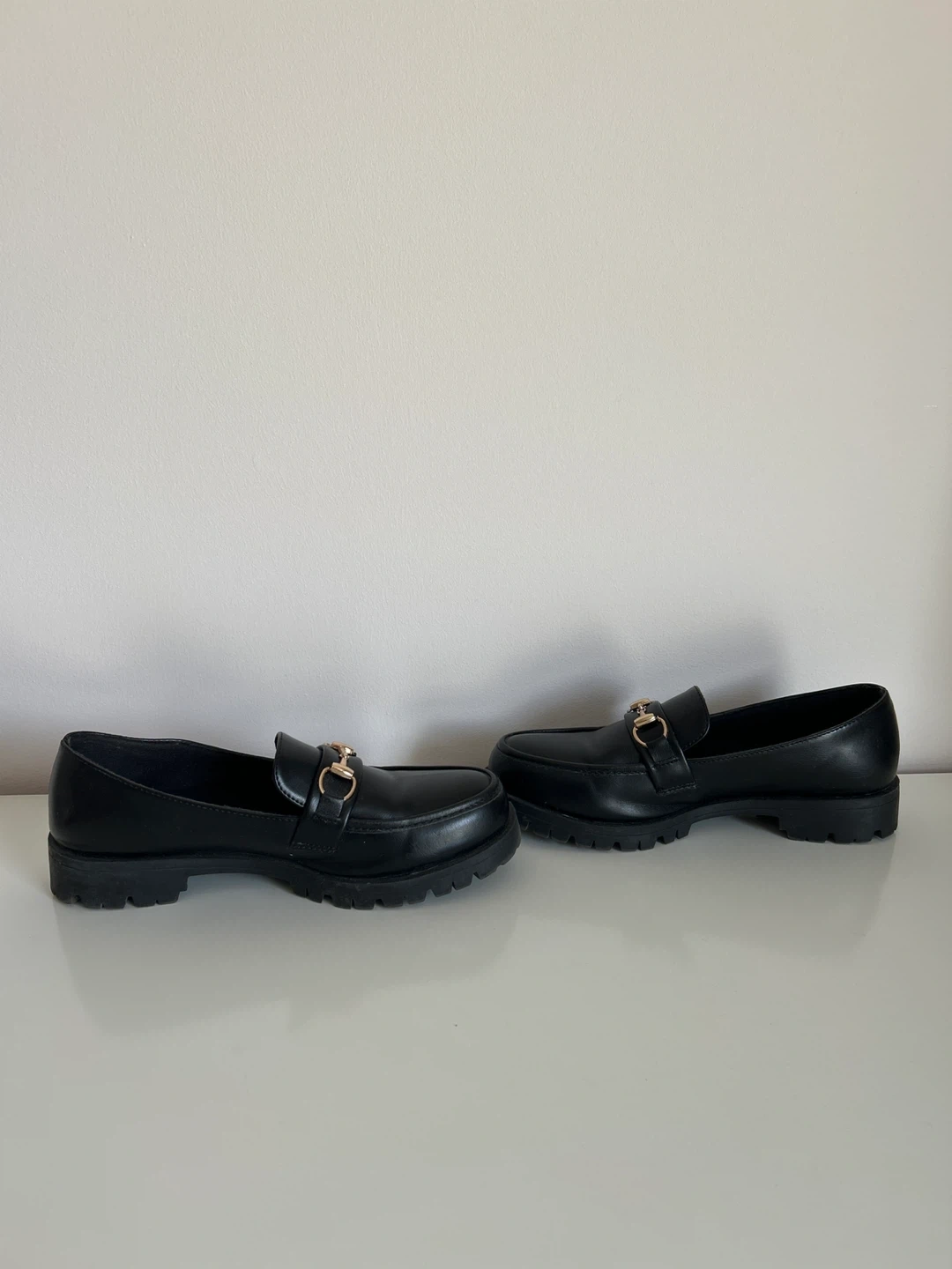 Selling a pair of gently worn stylish black loafers with a gold-toned buckle detail. They're in great condition and would be a lovely addition to your wardrobe! The shoes have a slightly chunky sole, making them both fashionable and comfortable for everyday wear.
