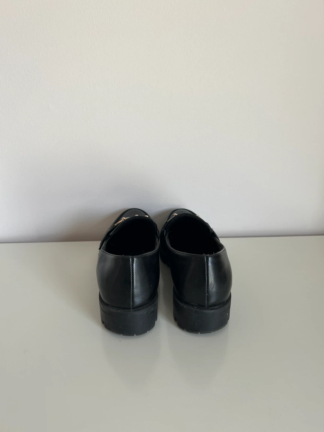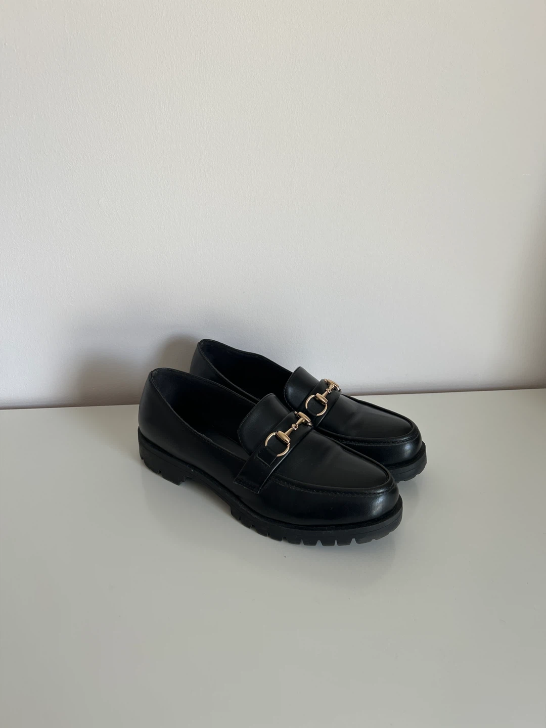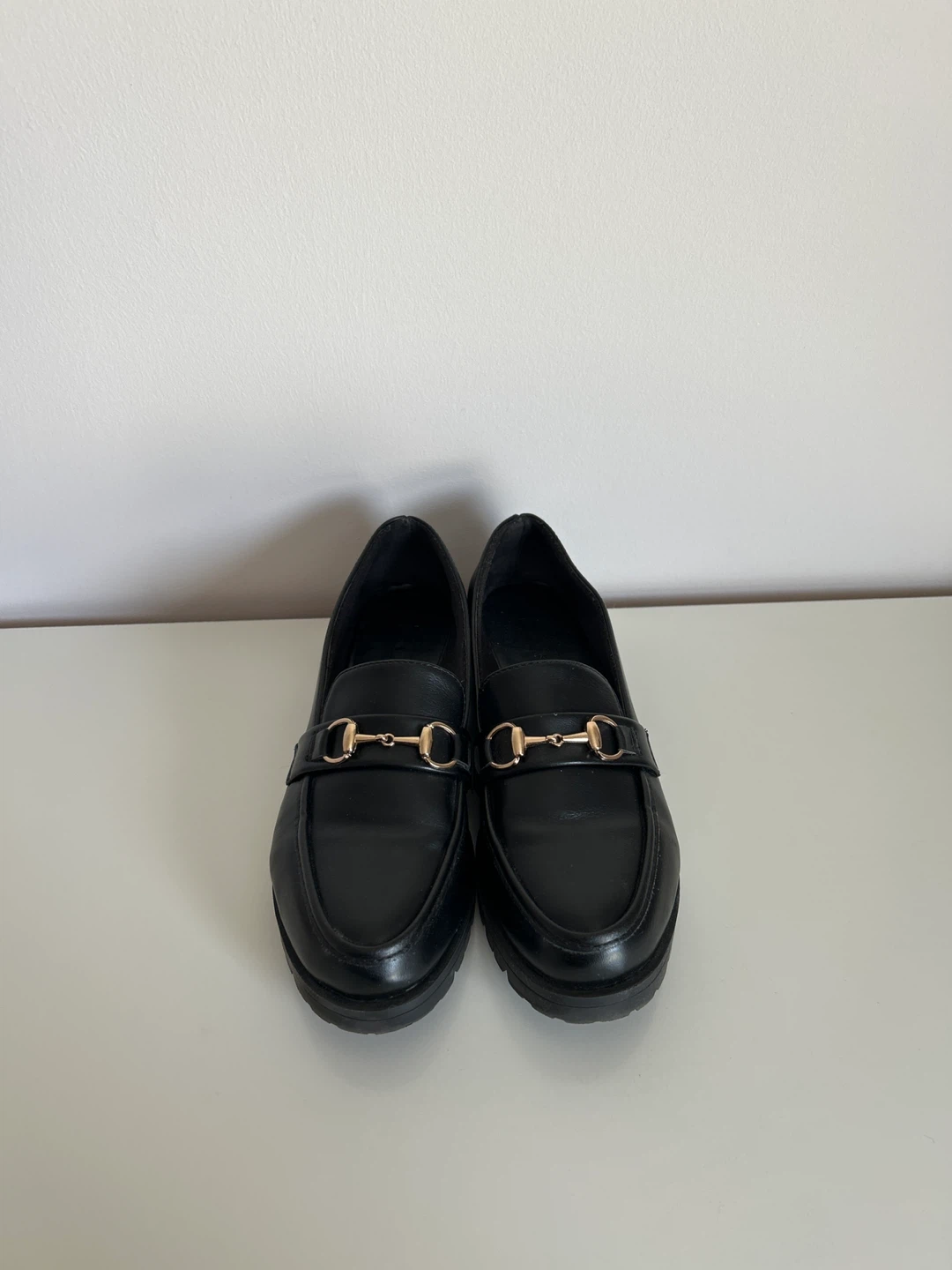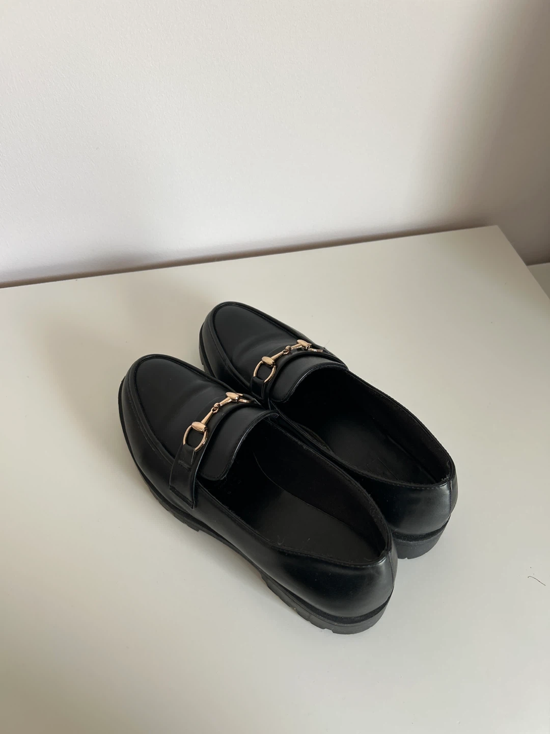 Selling a pair of gently worn stylish black loafers with a gold-toned buckle detail. They're in great condition and would be a lovely addition to your wardrobe! The shoes have a slightly chunky sole, making them both fashionable and comfortable for everyday wear.