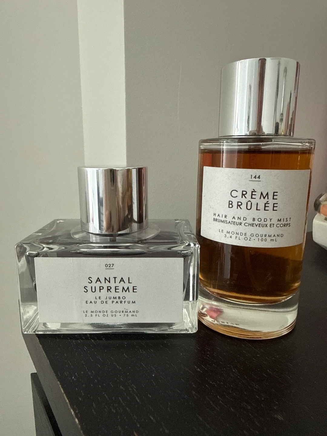 Selling two Le Monde Gourmand fragrances! One is Santal Supreme Le Jumbo Eau de Parfum (2.5 fl oz/75 mL) and the other is Crème Brûlée Hair and Body Mist (3.4 fl oz/100 mL)