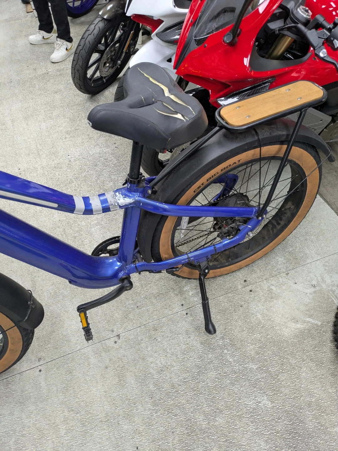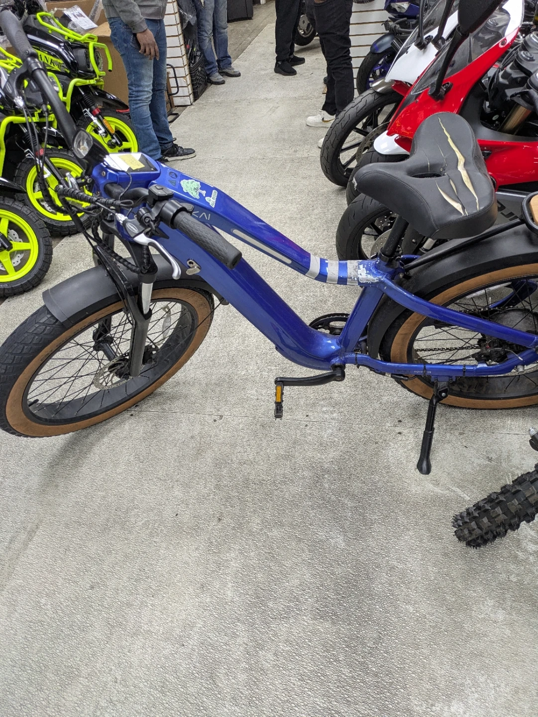 Selling a blue OKAI Cat Big Boat e-bike. It has a unique design and looks like it's ready for some fun rides! The tires are brand new... the seat and LCD Screen were vandalized but can be replaced.