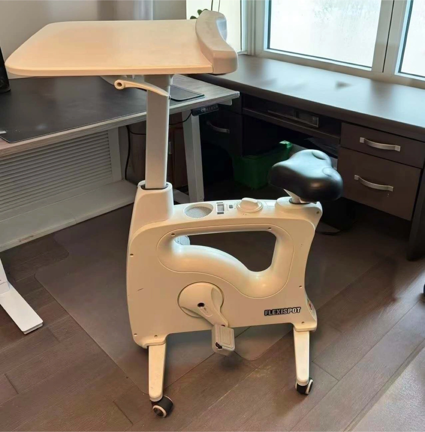 Selling a FlexiSpot desk bike in white! It's a great way to stay active while working from home. I've used it, so there are some signs of wear on the pedals, but it's still in good working condition. Perfect for getting your steps in during the day!