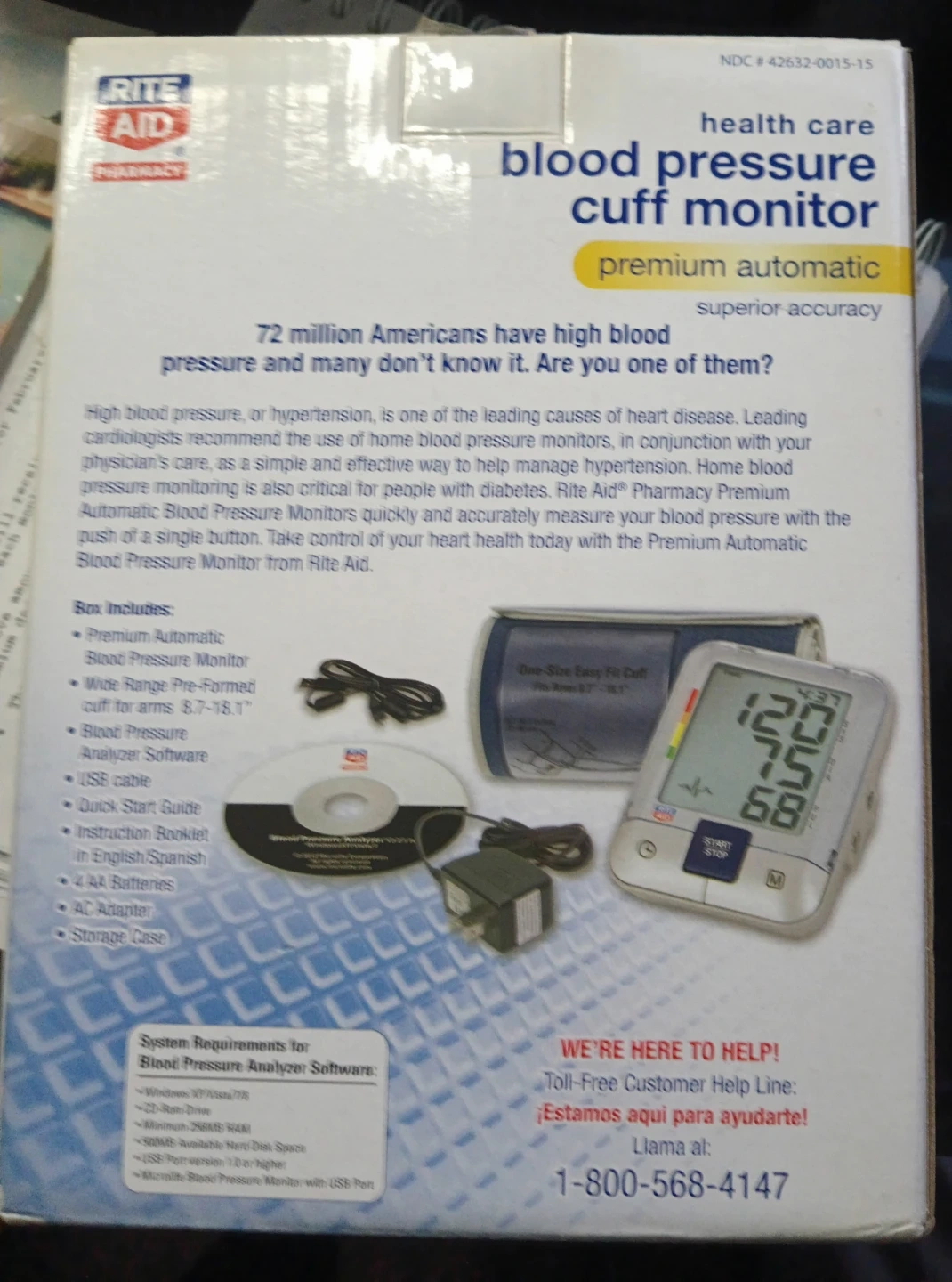 Selling a Rite Aid blood pressure cuff monitor. It's a premium automatic model with superior accuracy. The box includes the premium automatic monitor, a wide range pre-formed cuff for arms 8.7-18.1", blood pressure analyzer software, a USB cable, a quick start guide, an instruction booklet in both English and Spanish, 4 AA batteries, an AC adapter, and a storage case