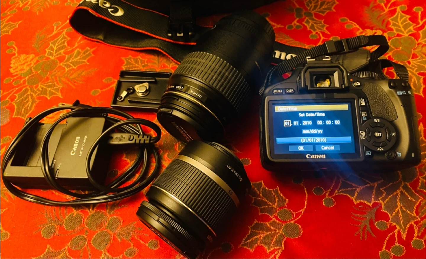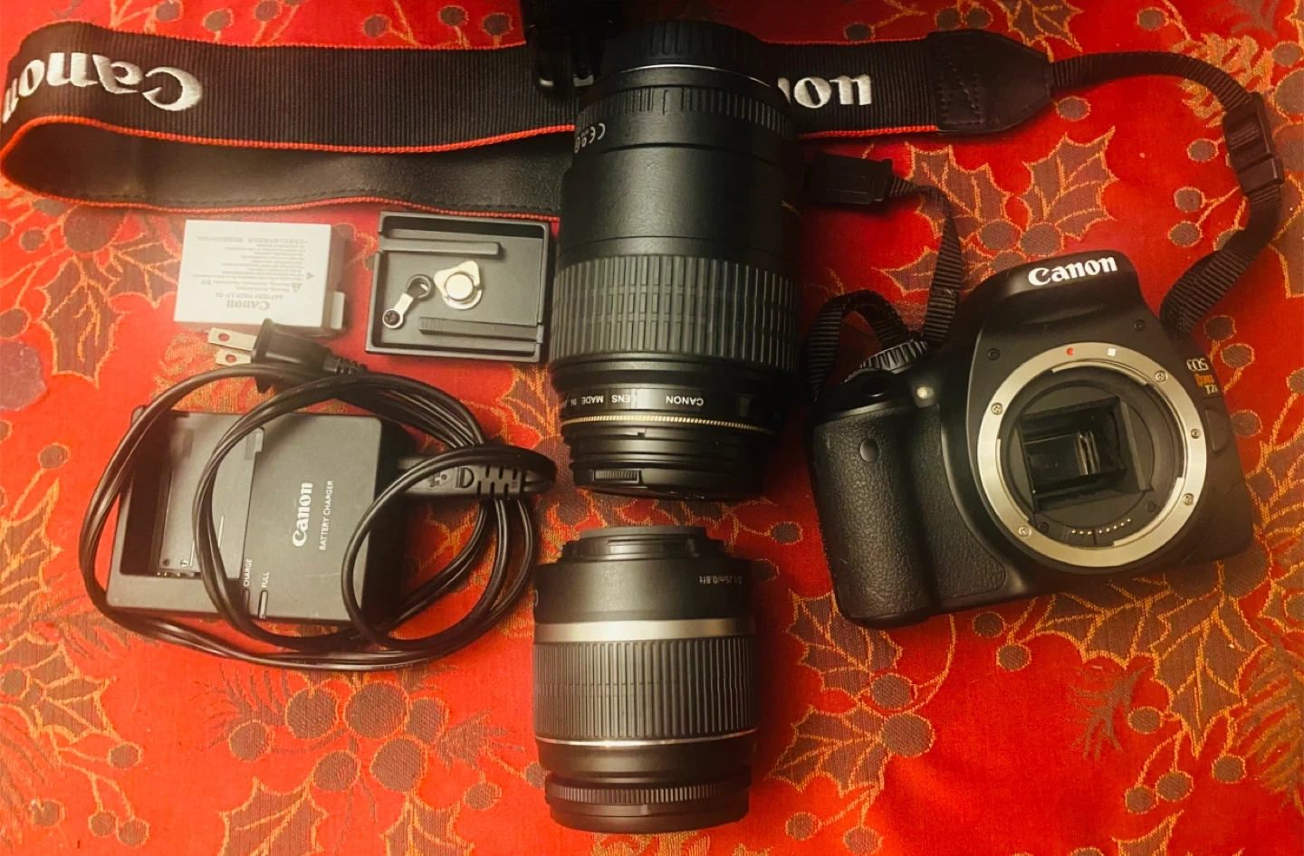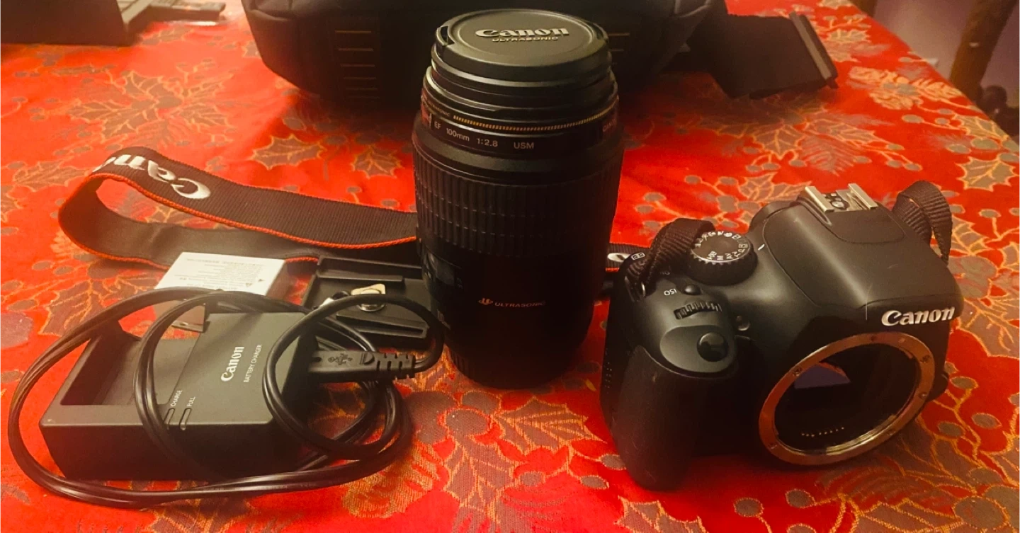Selling a Canon EOS Rebel T2i DSLR camera. It comes with a couple of lenses and a battery charger, tripod, and holder. Great for someone looking to get into photography! Barely used.