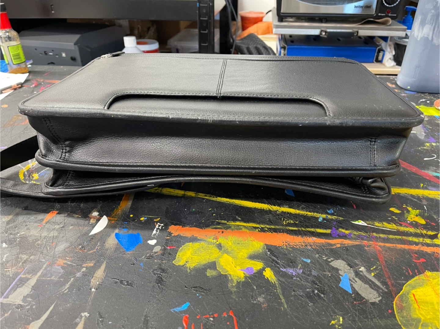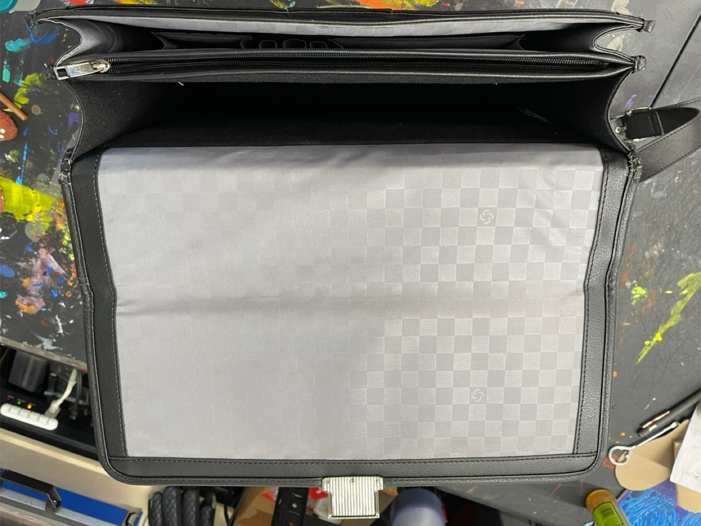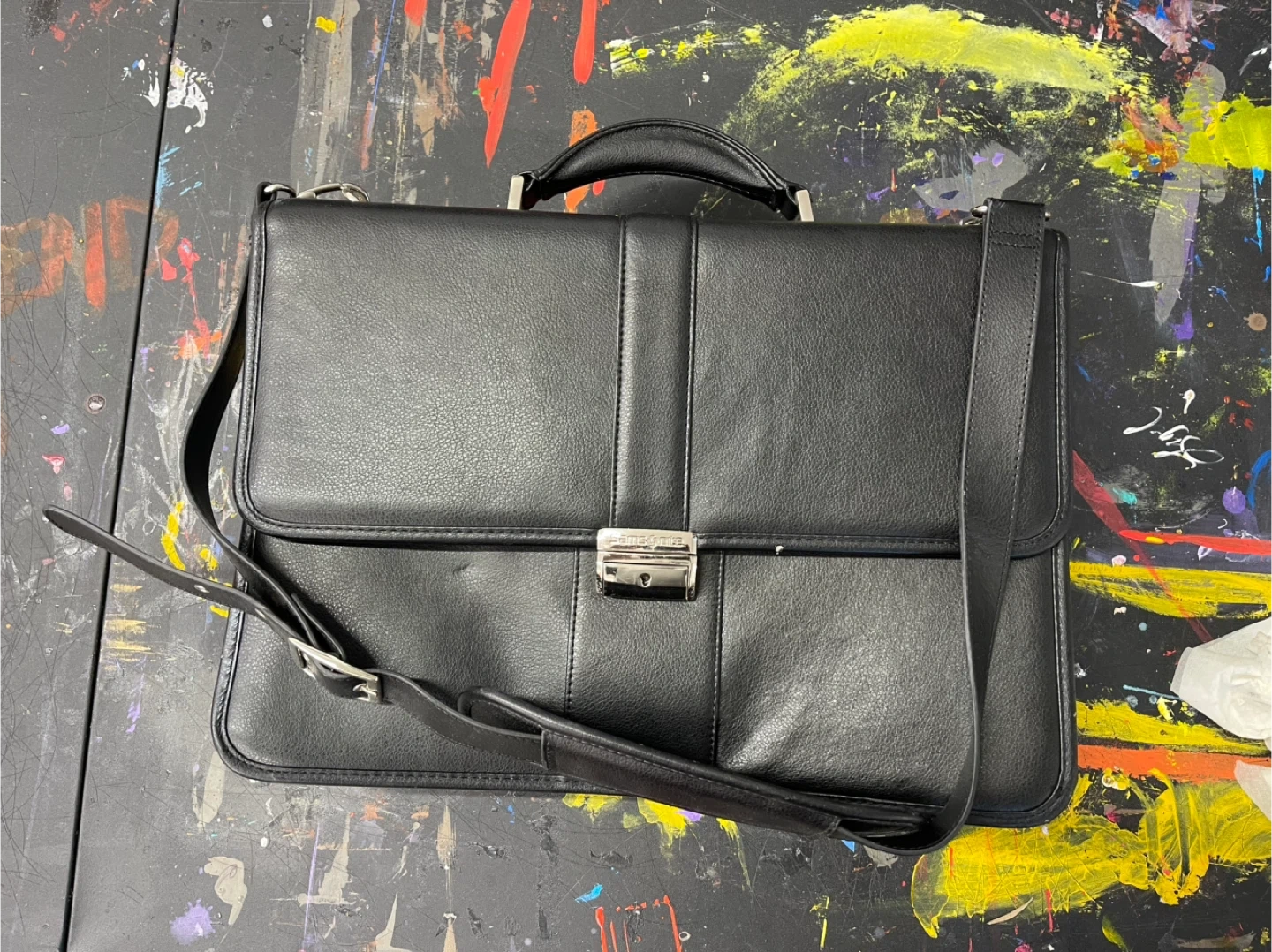 Selling a black leather Samsonite briefcase. It features a handle and a shoulder strap for easy carrying. The interior is lined with a gray checkered fabric. Perfect for work or travel!