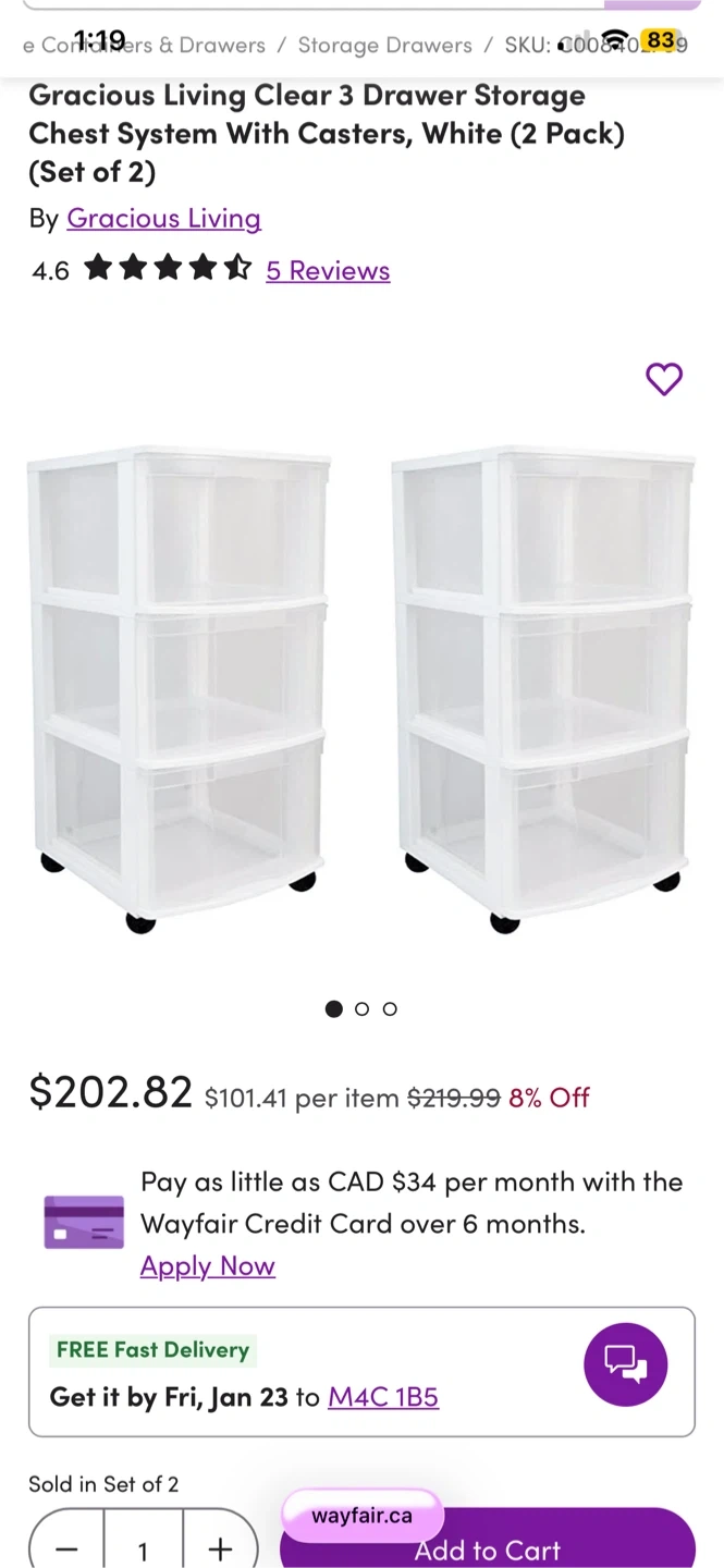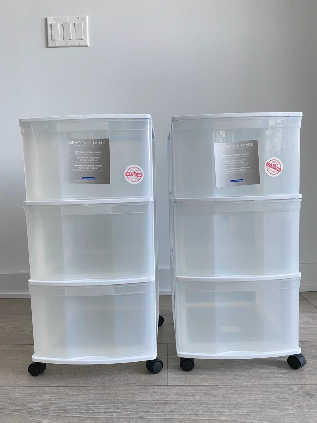 Selling set of 2 premium quality big stackable transparent drawers on wheels from Gracious Living. Proudly Made in Canada ๐จ๐ฆ!