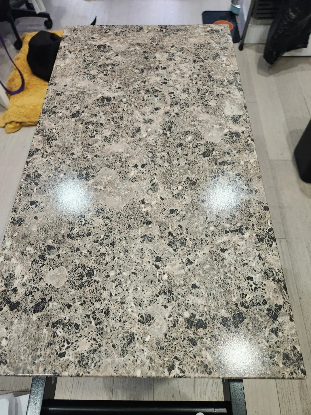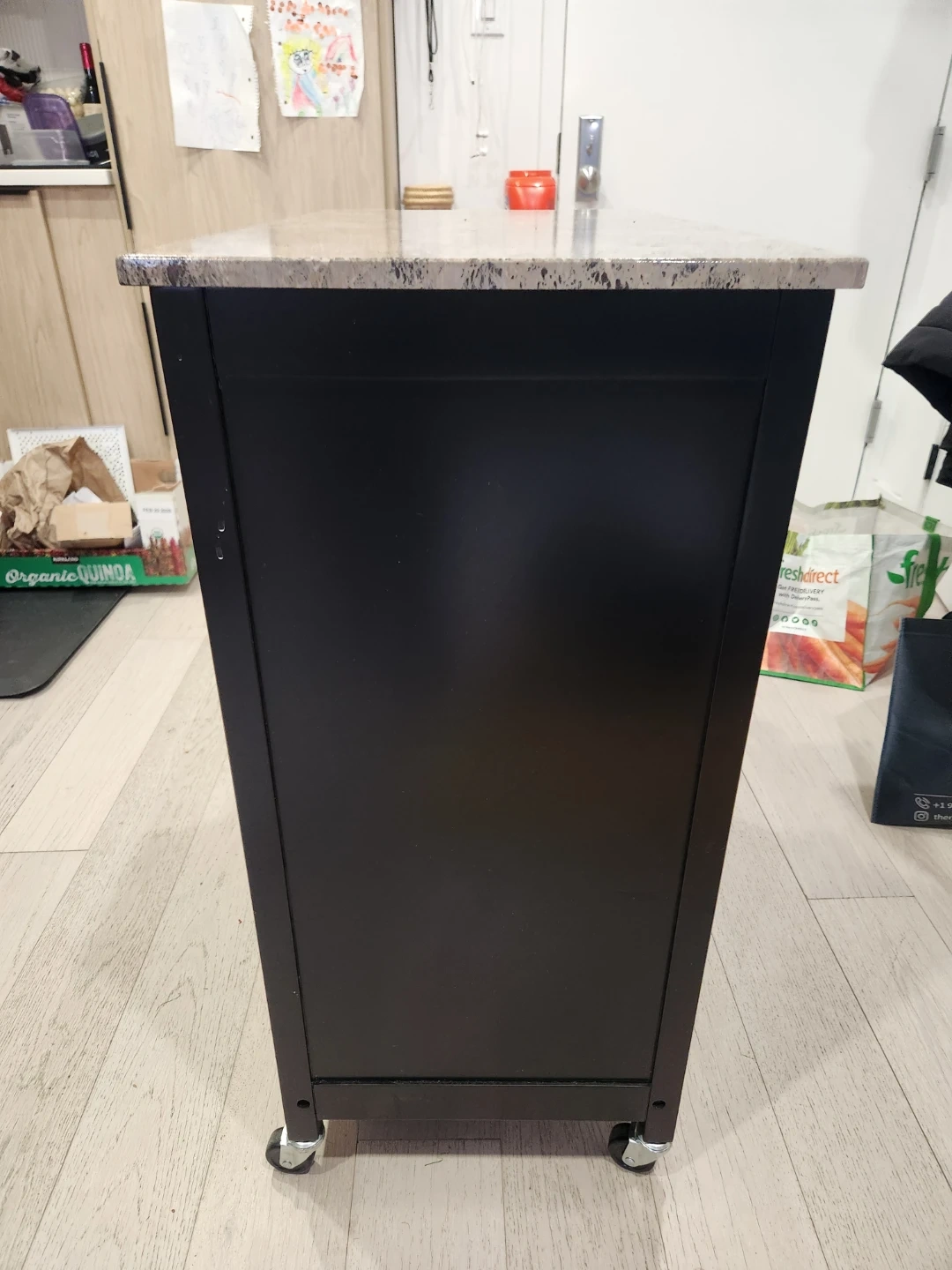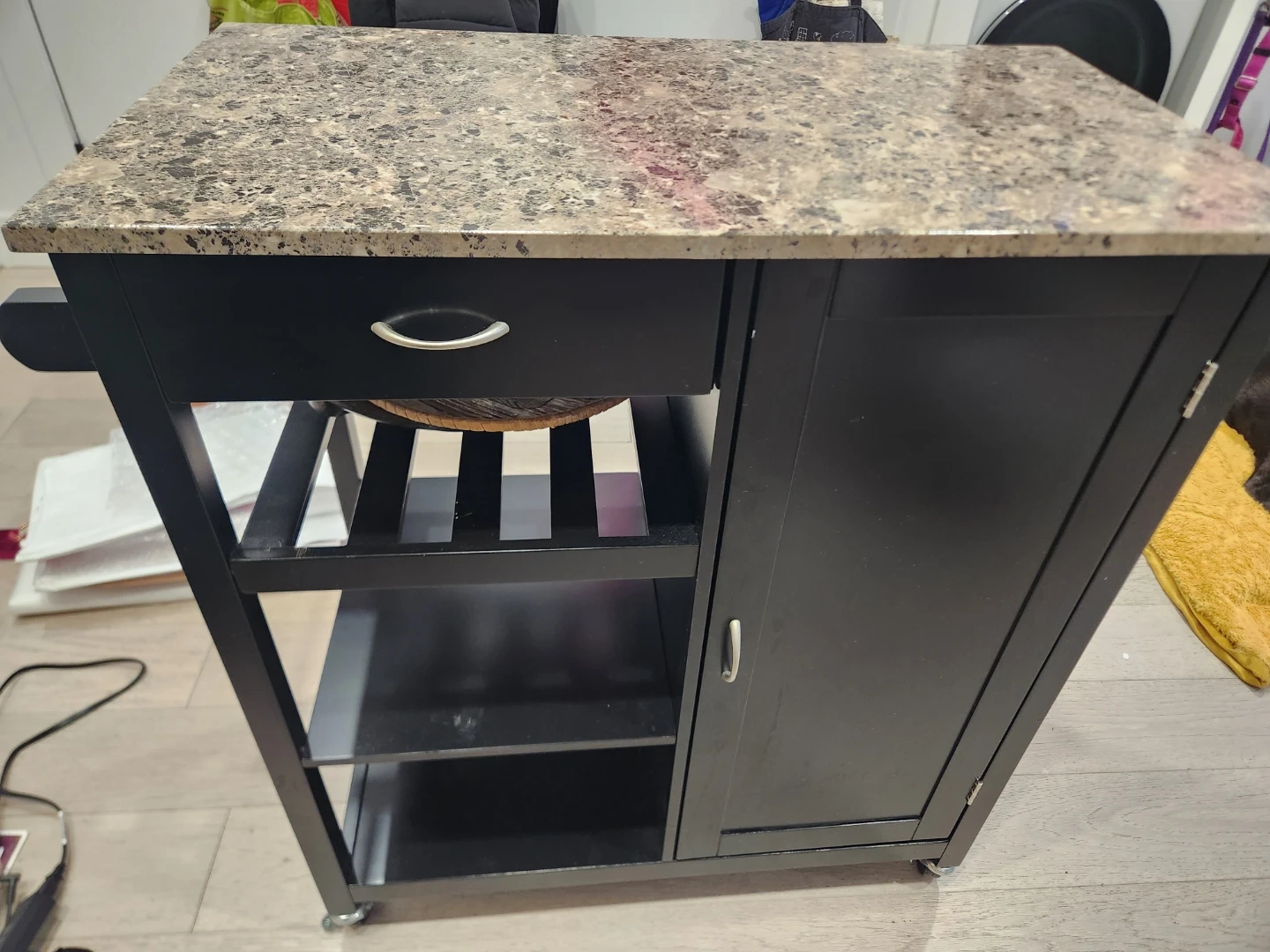 Selling a kitchen island cart with a faux marble top and black frame. It has a drawer, a cabinet, shelves, towel rack, and 3 shelves. It also has wheels, so it can be easily moved around. Great for adding extra counter space and storage to your kitchen!