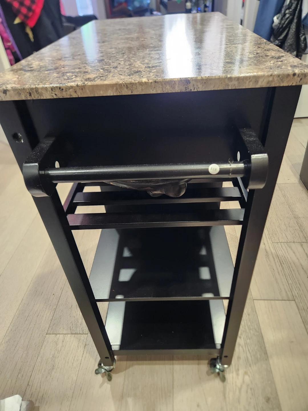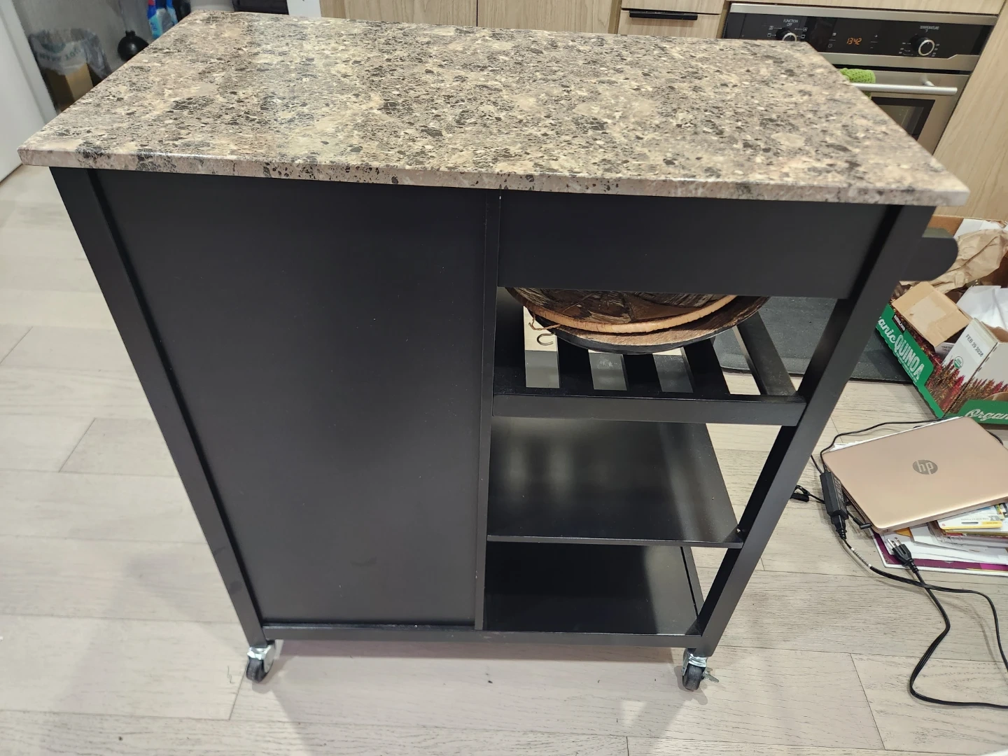 Selling a kitchen island cart with a faux marble top and black frame. It has a drawer, a cabinet, shelves, towel rack, and 3 shelves. It also has wheels, so it can be easily moved around. Great for adding extra counter space and storage to your kitchen!