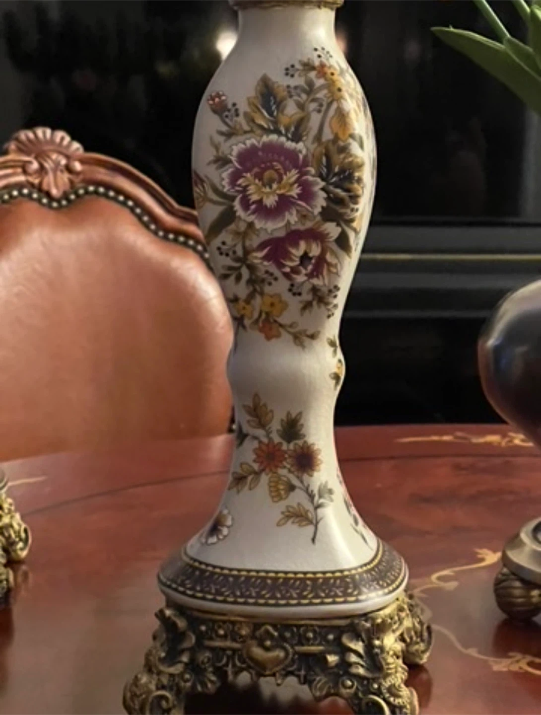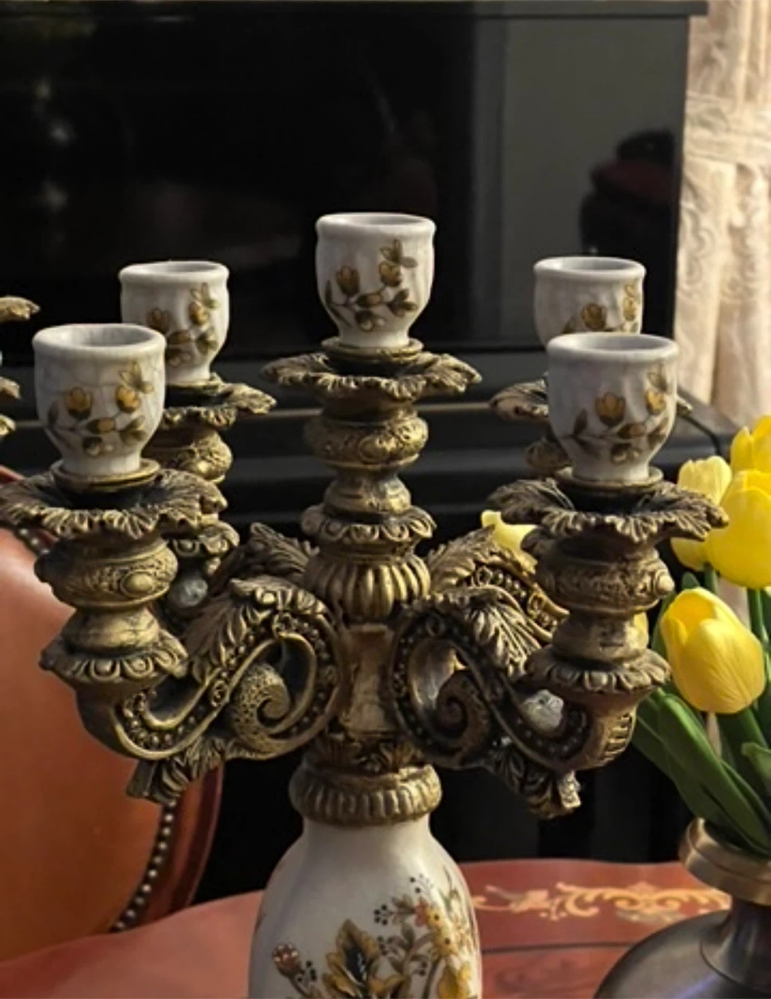 Selling a vintage candelabra with a beautiful floral design. It has an ornate, antique look with gold accents and a white base adorned with floral patterns. It would be a lovely addition to any home decor!