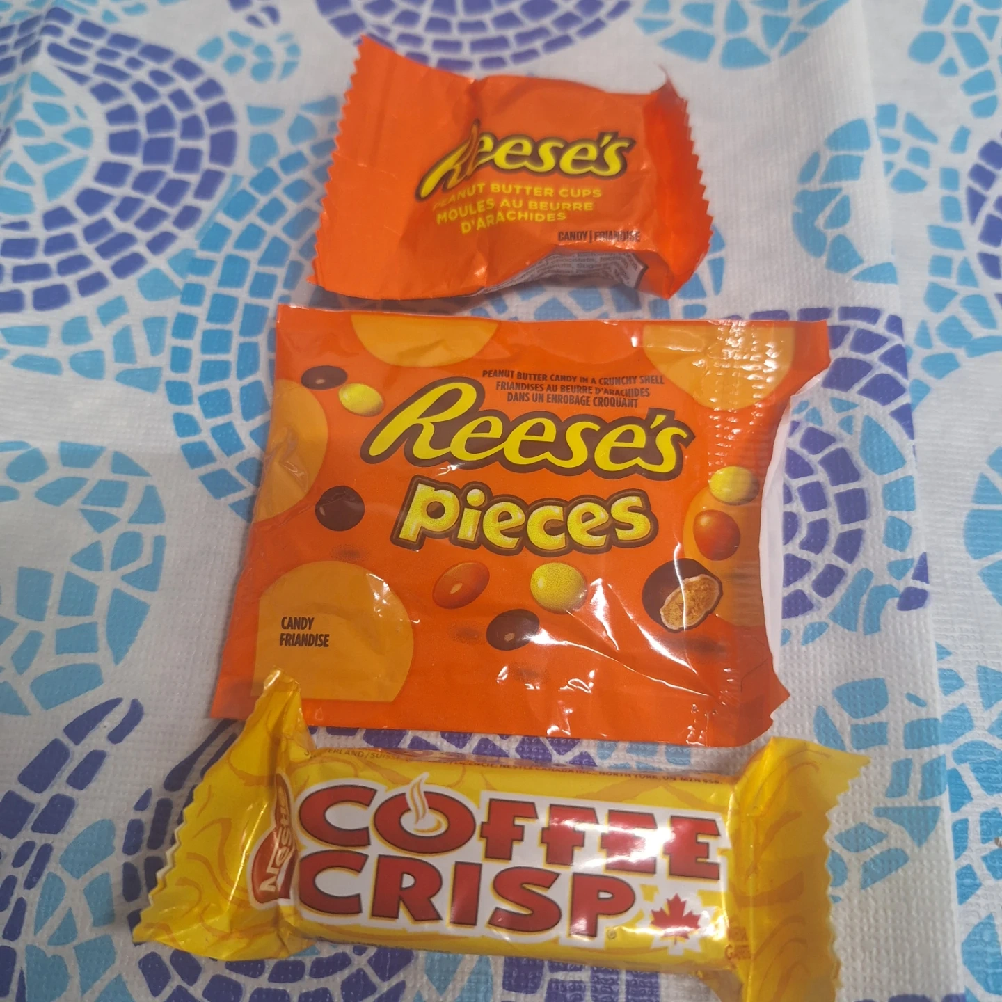 Selling a delectable assortment of treats that includes Reese's Peanut Butter Cups, Reese's Pieces, and a Coffee Crisp bar, perfect for satisfying your sweet cravings!