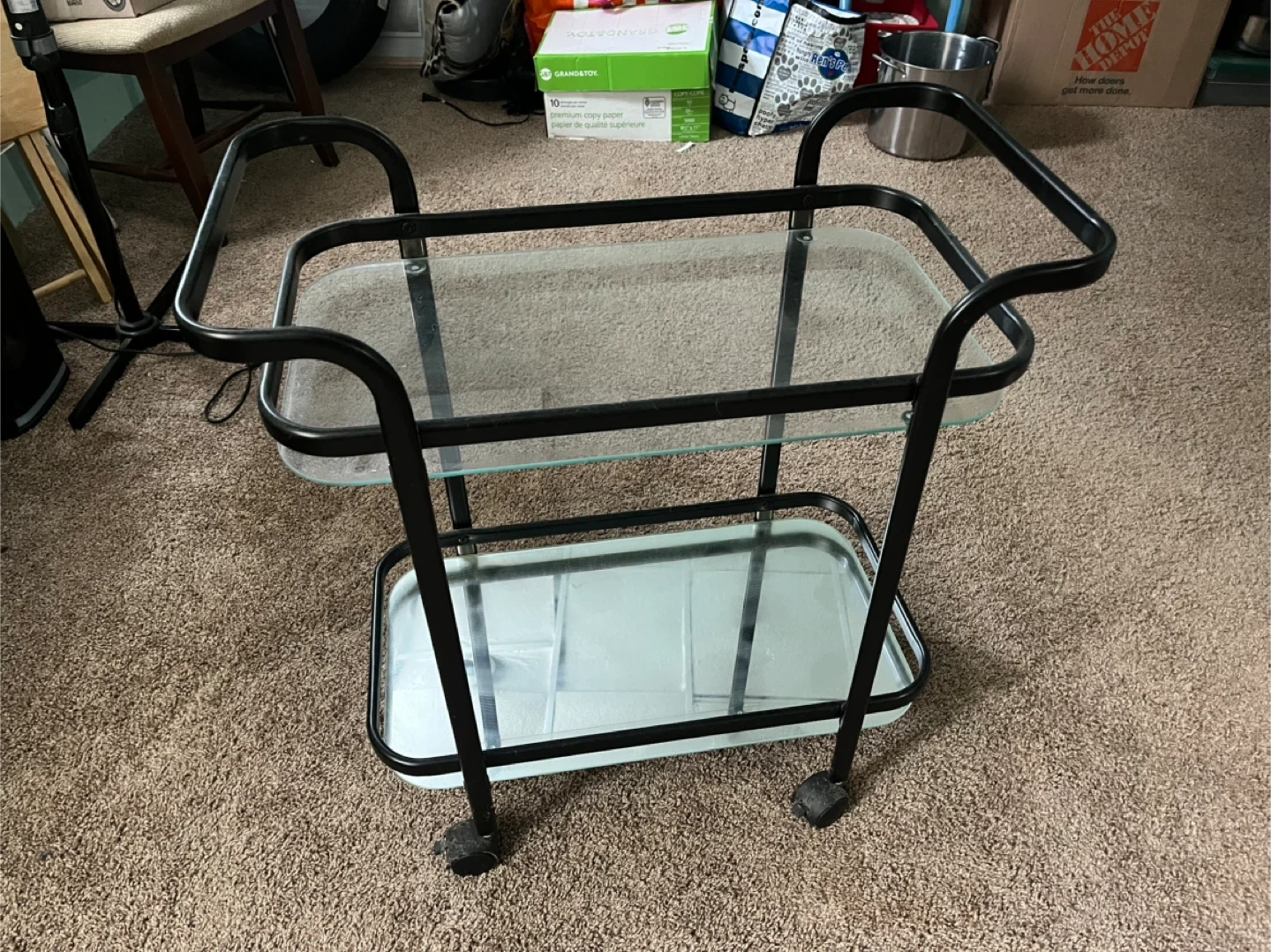 This stylish bar cart features a black metal frame and two glass shelves, perfect for adding a touch of elegance to your home. It's in great condition and ready to roll into your space!