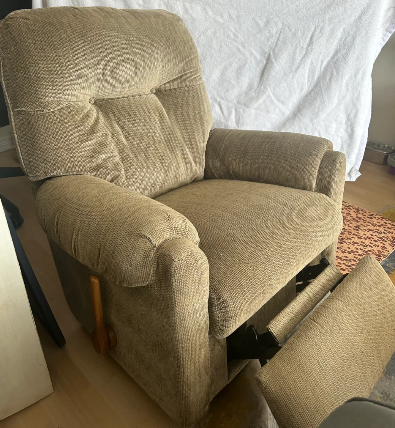 Selling a La-Z-Boy recliner in good condition. It's a comfy chair in a neutral colour. It has a lever on the side to easily adjust the reclining position, and also comes apart for easy transportation.