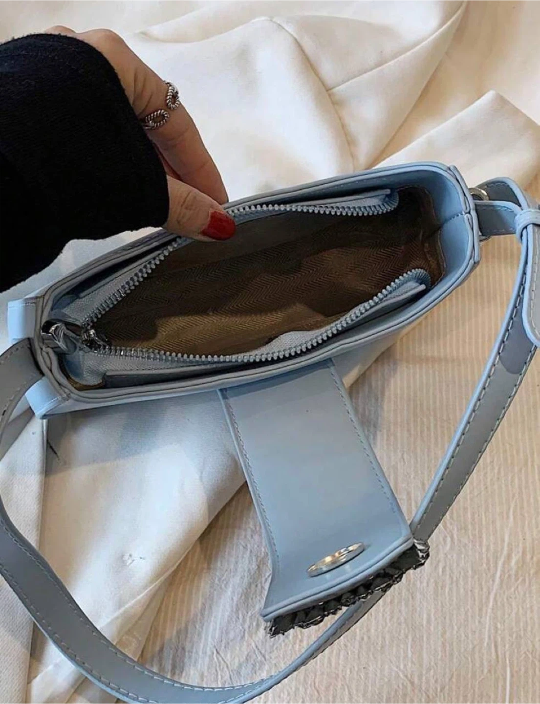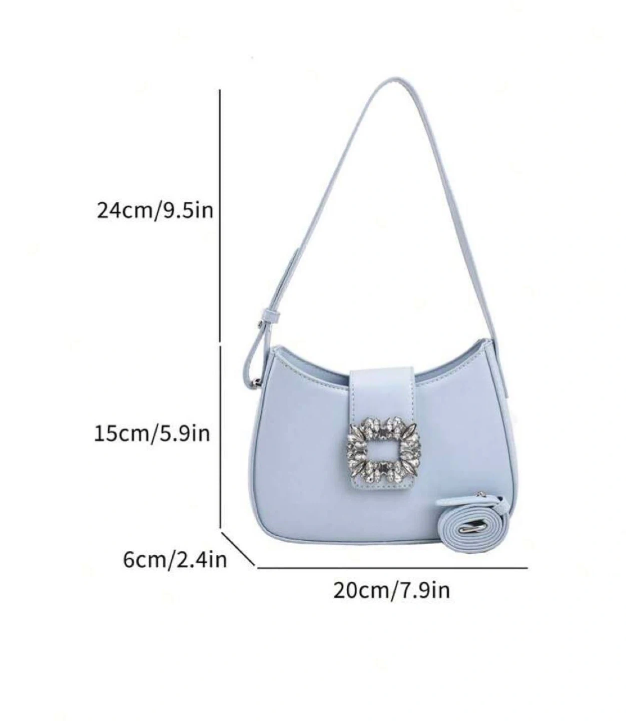 Stunning light blue baguette bag. Features a large crystal buckle. Adjustable shoulder strap. Perfect for everyday use or special occasions.