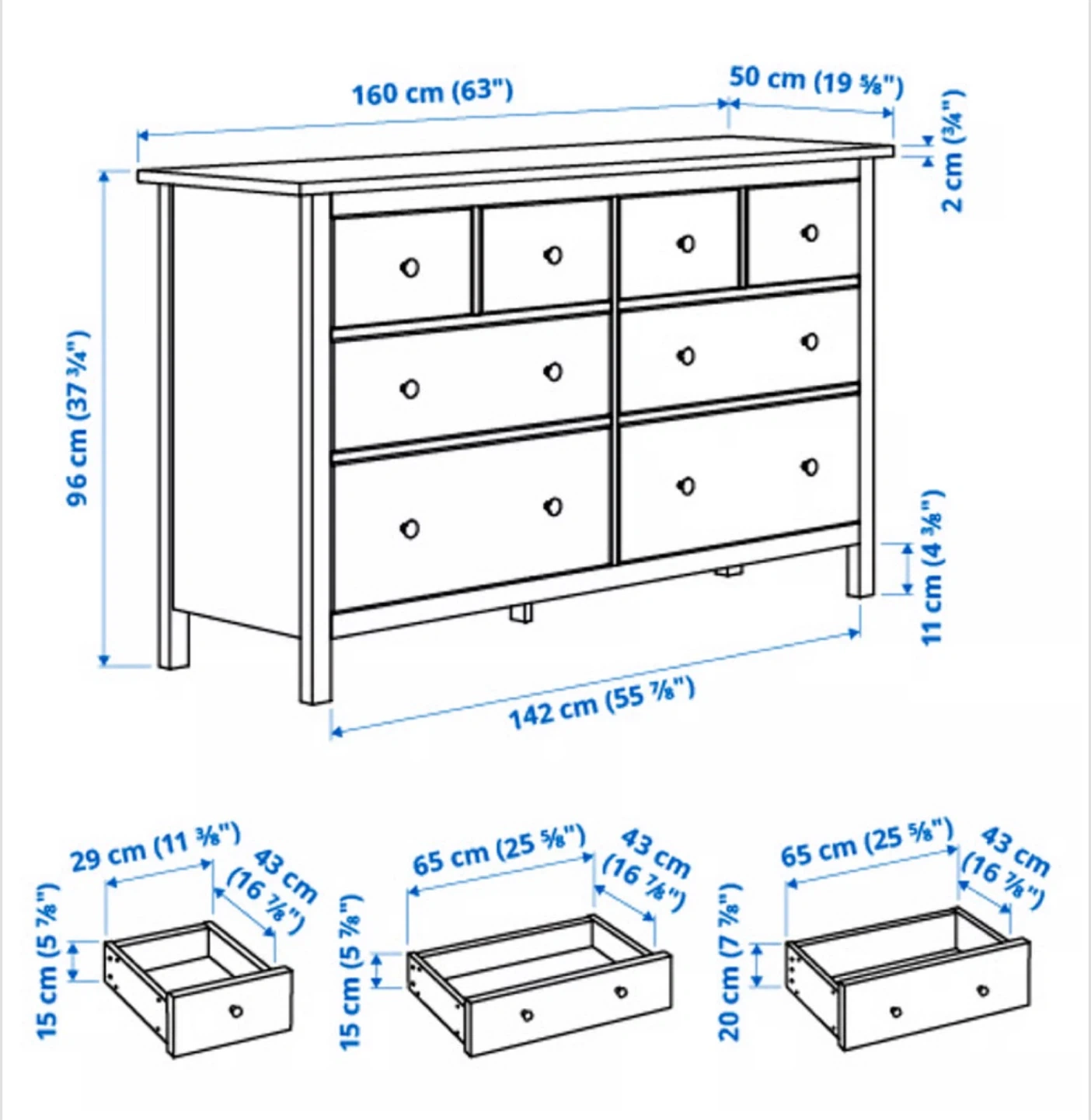 - Large drawers: 7 7/8 inches