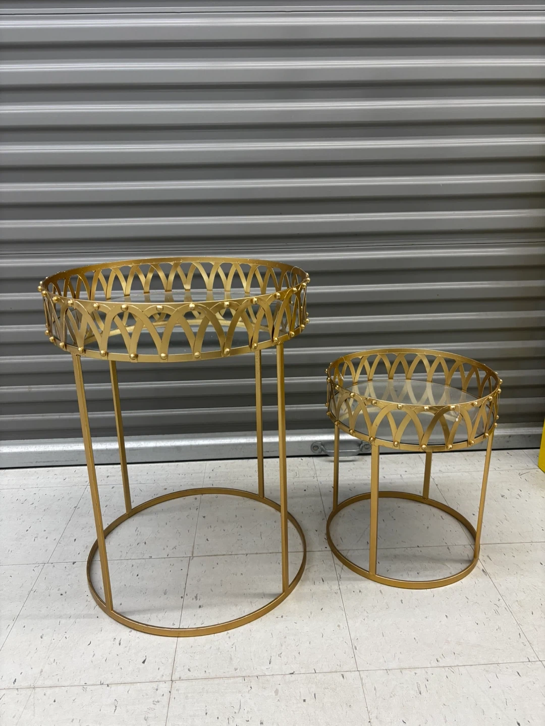 Selling a set of two gold nesting tables! They're in great shape and would look lovely in any living room, bedroom or any party set ups. The tables have a unique design with a geometric pattern around the edges and a mirrored top. Perfect for adding a touch of elegance to your space