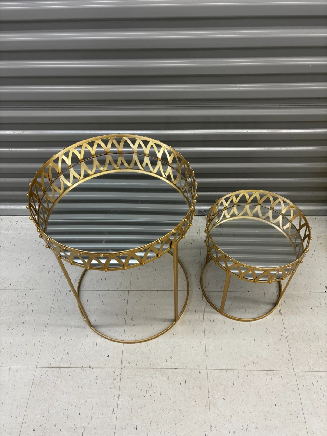 Selling a set of two gold nesting tables! They're in great shape and would look lovely in any living room, bedroom or any party set ups. The tables have a unique design with a geometric pattern around the edges and a mirrored top. Perfect for adding a touch of elegance to your space
