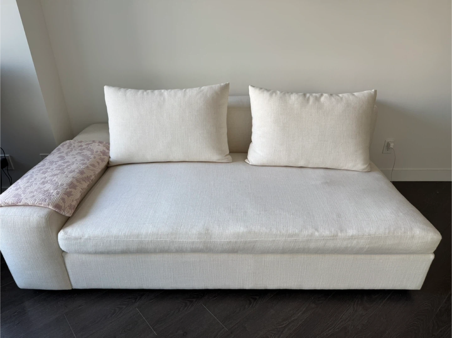 Priced to sell. Comfy, beautiful white sofa / sofa bed with 2 huge cushions; washable seat and cushion covers; easy to care for; in excellent condition (from smoke-free, pet-free home). Must go by Jan 28th.