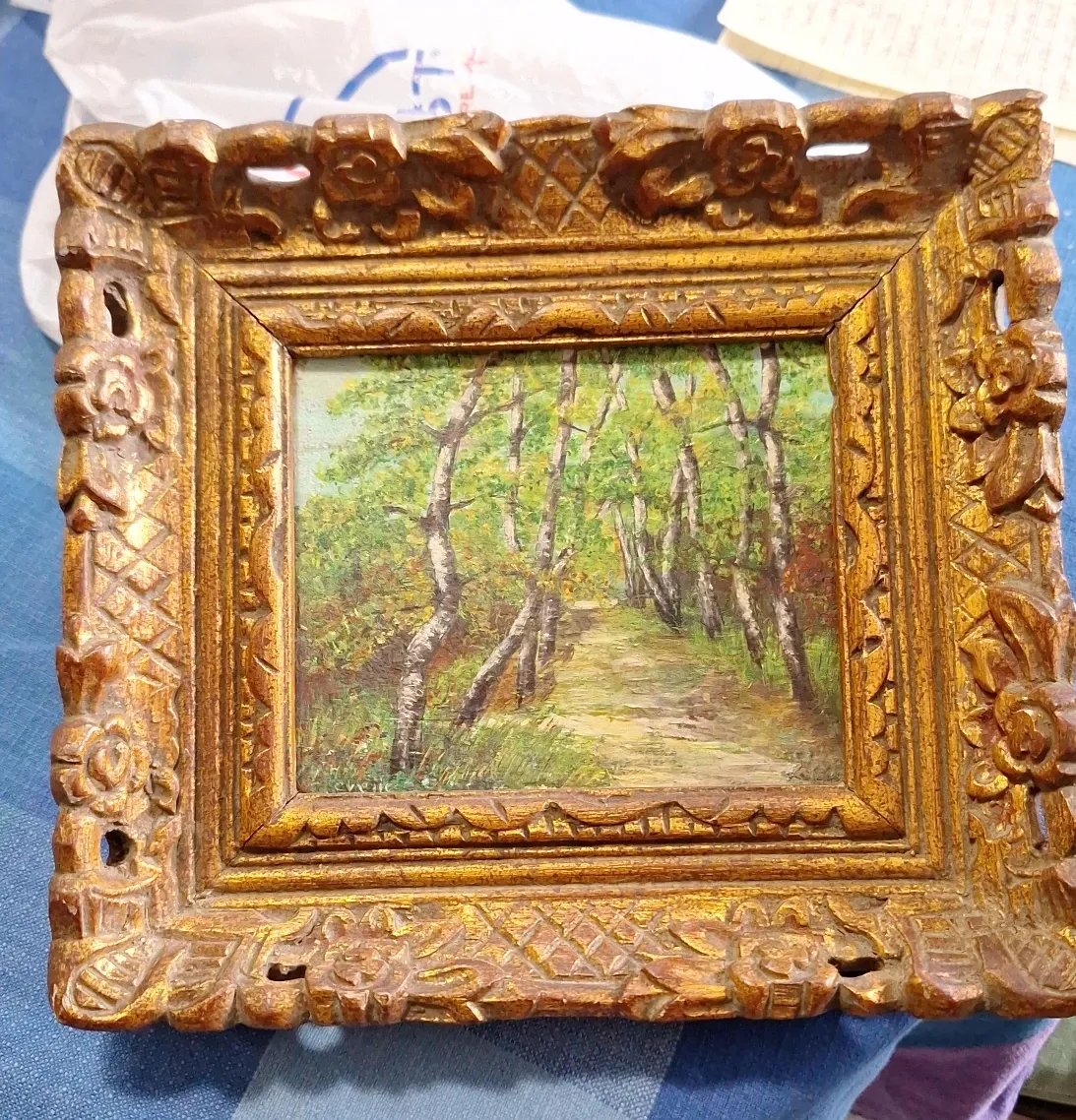 Selling a vintage framed painting of a forest scene. The frame is ornate and gold-toned, adding a touch of classic charm to the artwork. Perfect for adding a bit of nature-inspired art to your home