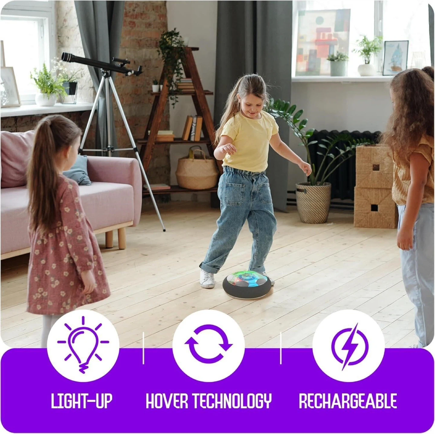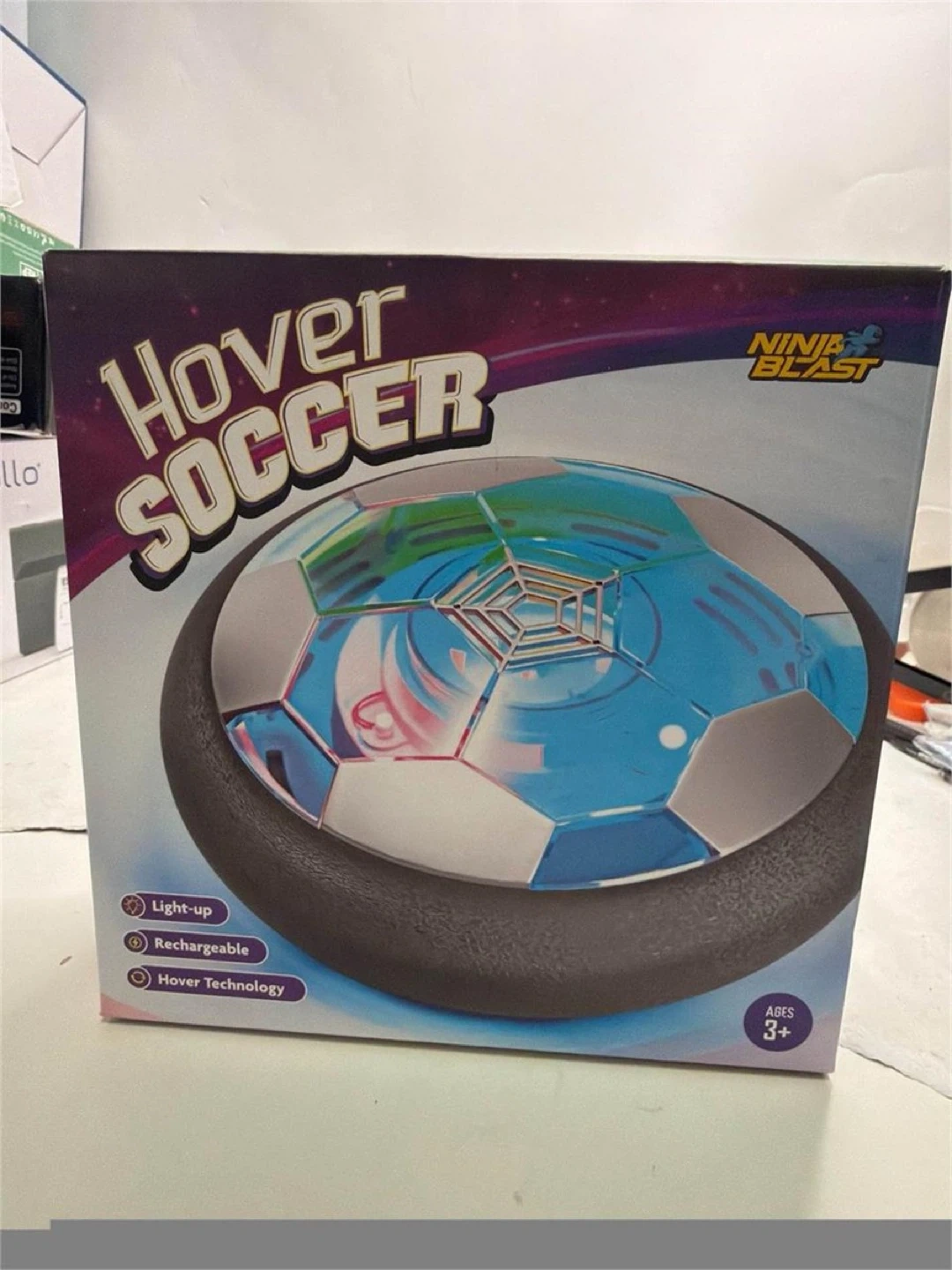 I'm selling a Ninja Blast Hover Soccer ball! It's rechargeable and has light-up features. It uses hover technology and is recommended for ages 3+. It floats like a bubble and kicks like a ball, so you can have soccer fun anytime, anywhere!