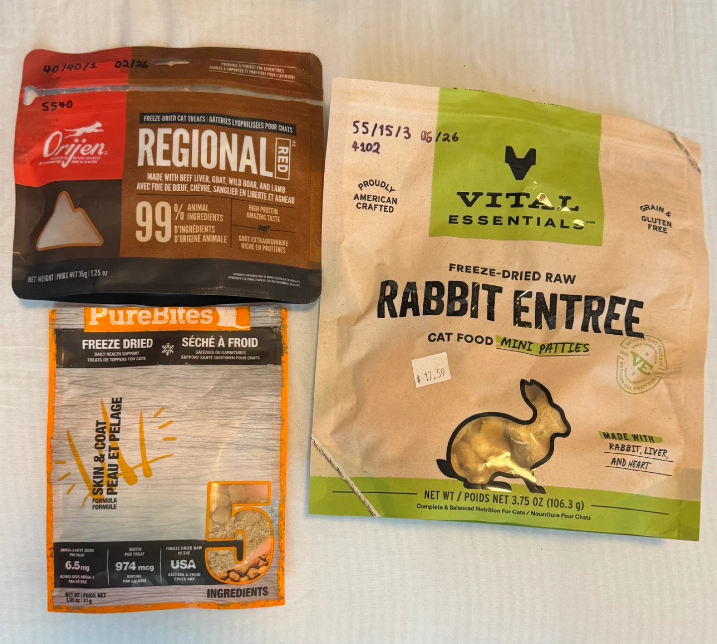 - Orijen Regional Red: Made with beef liver, goat, wild boar, and lamb. Expiry Date: February 2026 - PureBites Freeze Dried: Daily health support treats for skin & coat. Expiry Date: November 2027 - Vital Essentials Rabbit Entree: Grain & Gluten Free, made with rabbit, liver, and heart. Expiry Date: June 2026