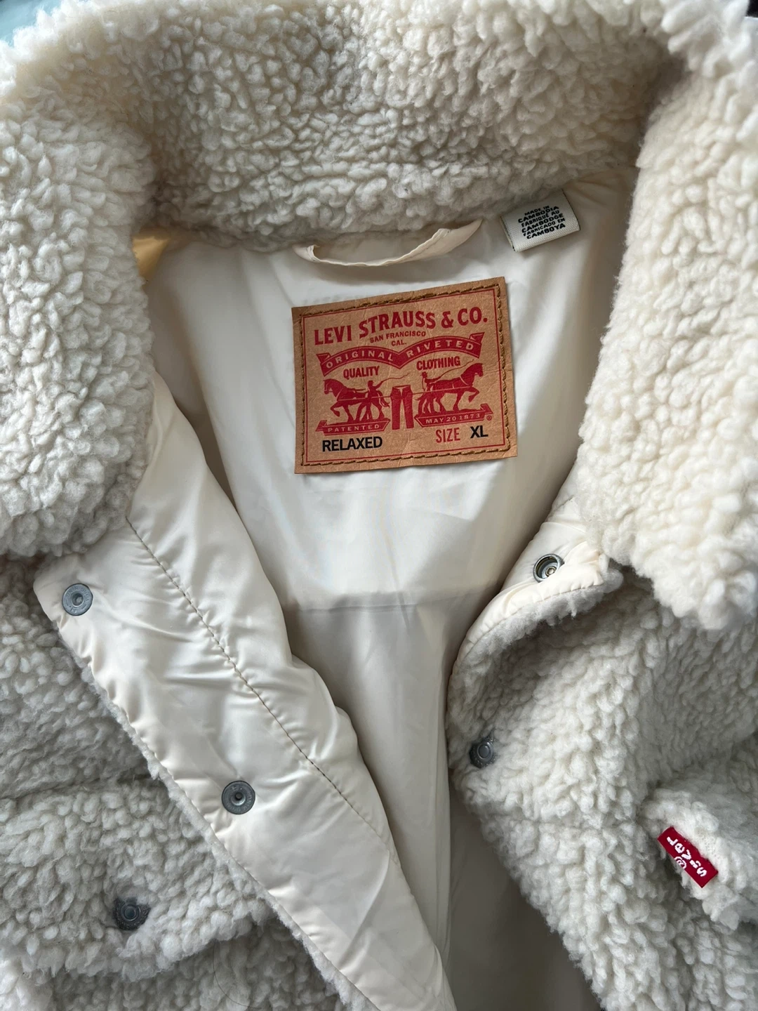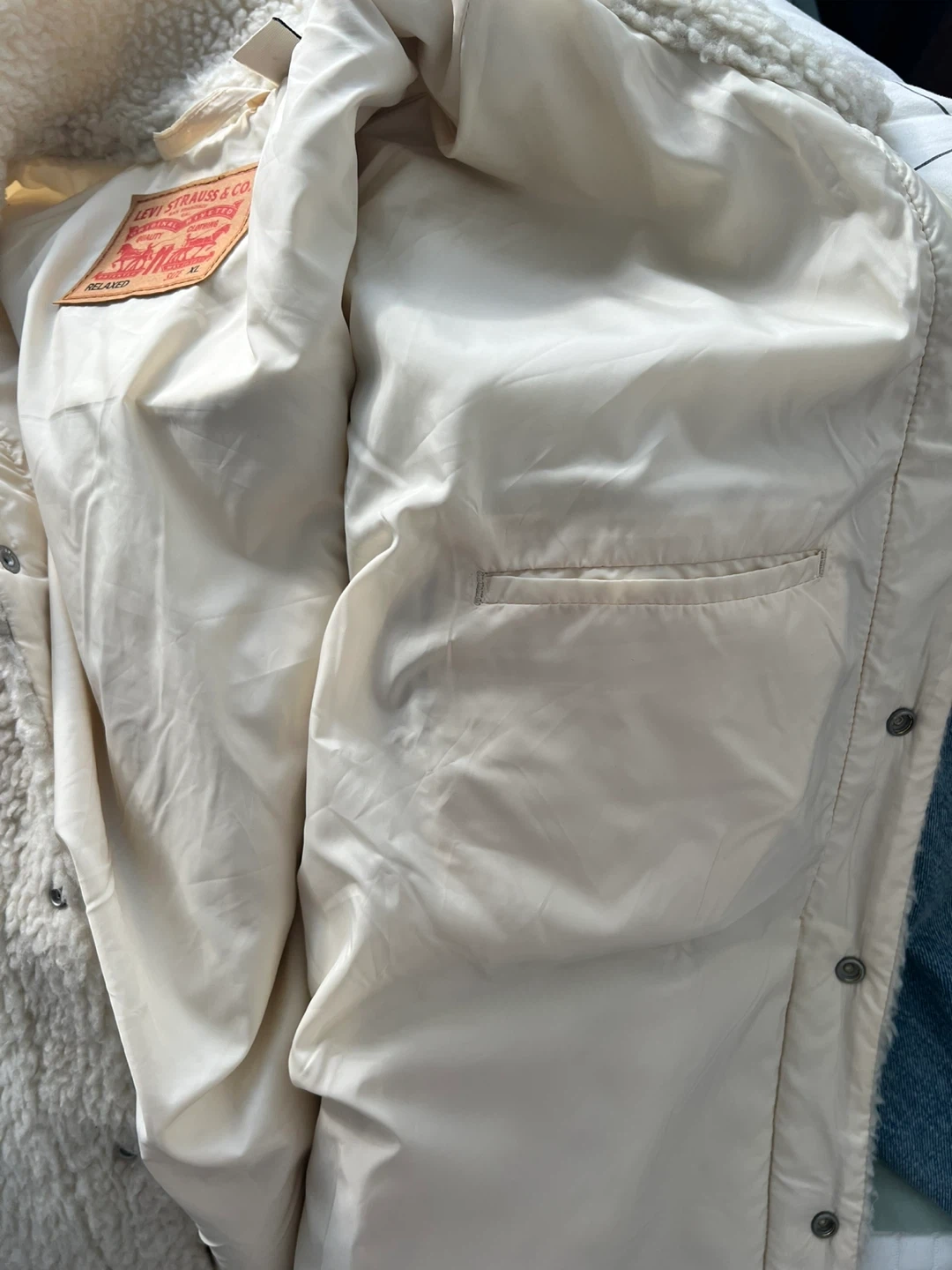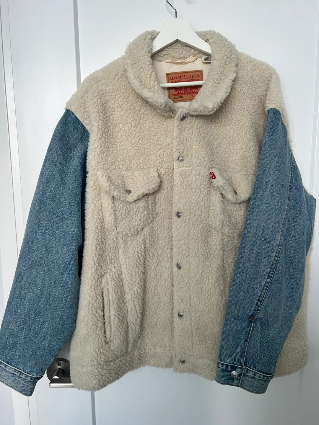 Selling a stylish Levi's "mixed media" trucker jacket. Features a warm sherpa (faux shearling) body in cream/white with contrasting denim sleeves.