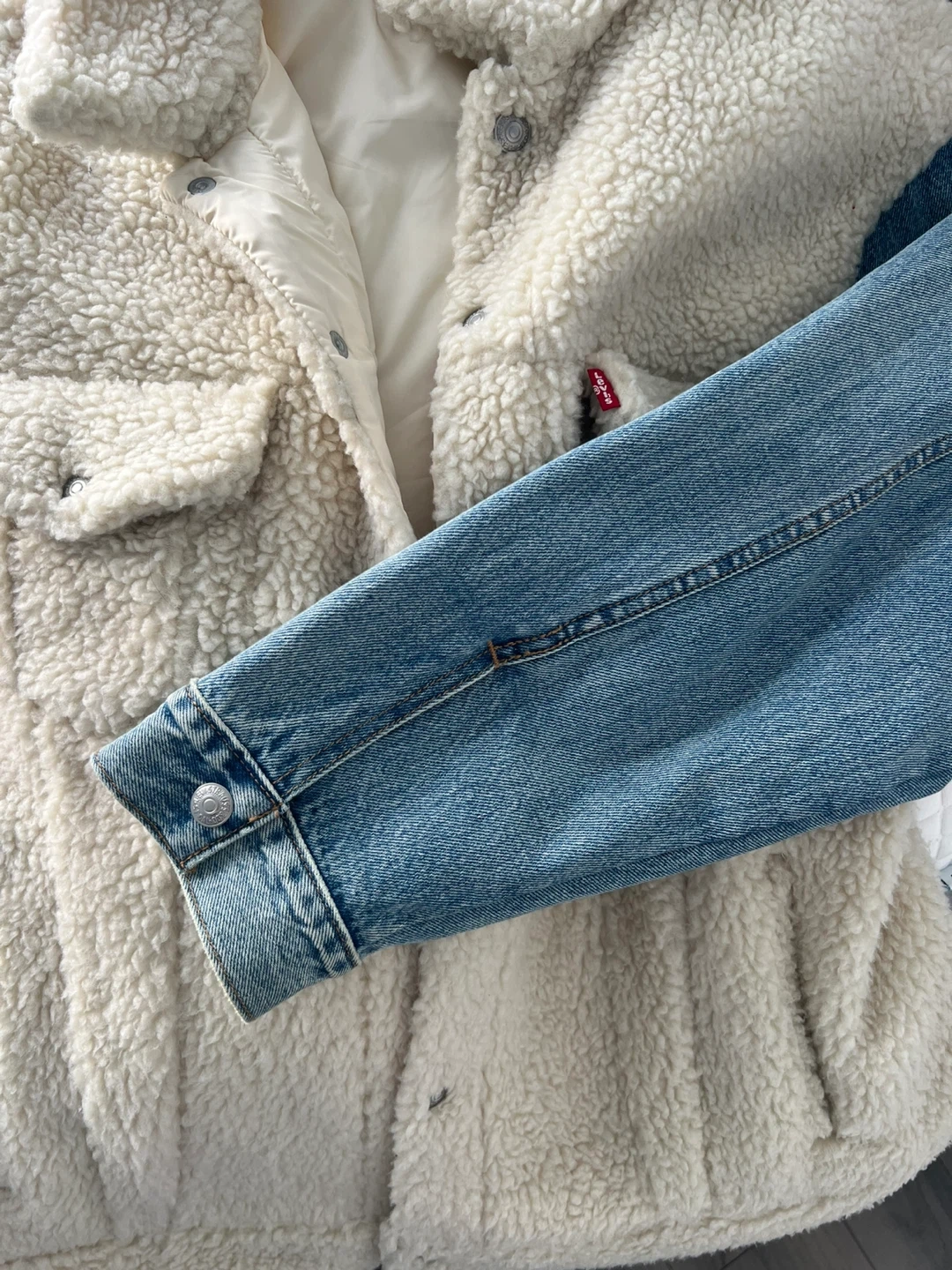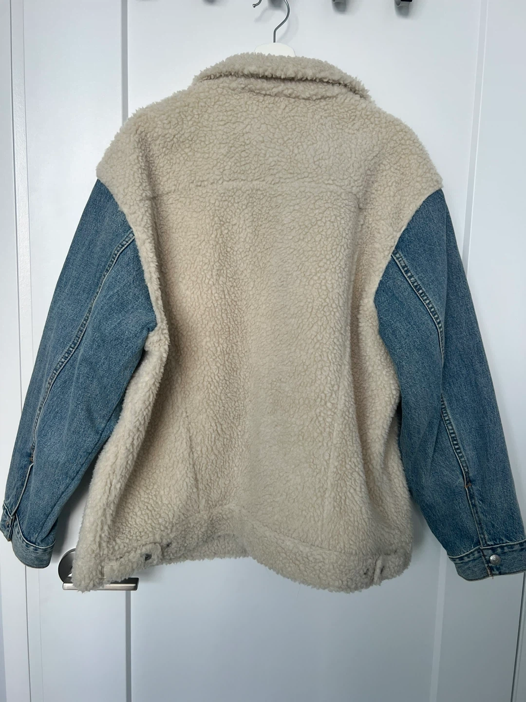 Selling a stylish Levi's "mixed media" trucker jacket. Features a warm sherpa (faux shearling) body in cream/white with contrasting denim sleeves.