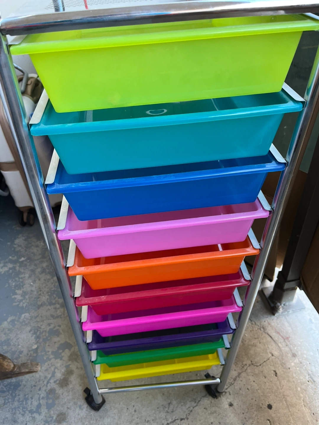 Here's a fun and functional rolling cart! It features 10 colourful drawers in a rainbow of shades. Perfect for organizing your art supplies, office essentials, or anything else you need to keep tidy. It's in great shape and ready to roll into your home!